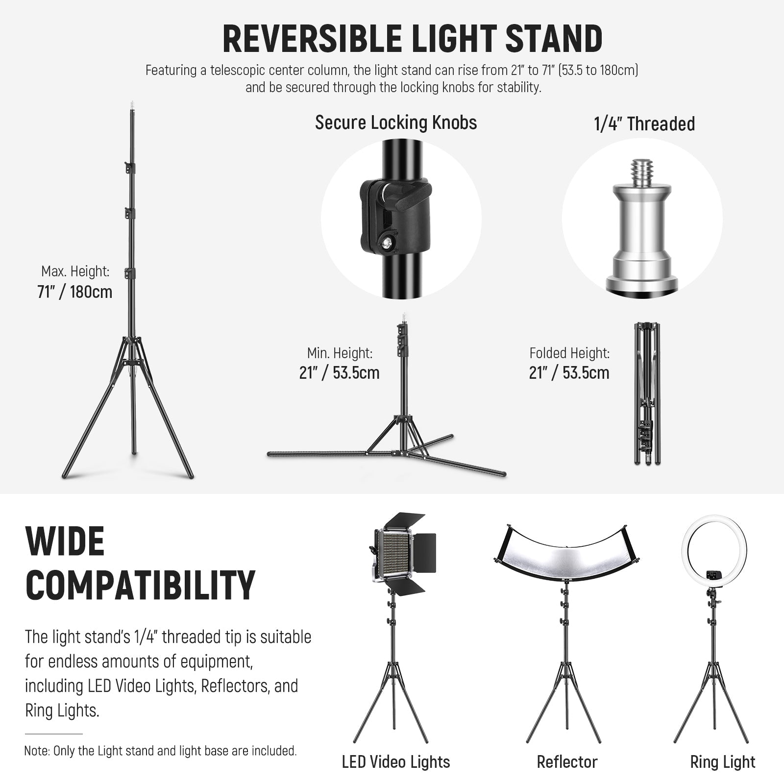 - Reversible Folding Light Stand- The reversible light stand with 3 telescopic sections can extend to 6ft (180cm) for different height requirements and fold down to a small size for simple storage and transportation