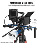 - Extended 15mm Rods with Screw Plugs- Included are three 15mm rods: two 16" (40cm) vertical bars and one 12" (30cm) crossbar. Extended vertical rods with front and rear adjustment space for the camera mount baseplate, shoulder pads, handles, and other accessories. Both ends of the rods have removable M12x1.5 threaded end caps to prevent them from falling off and increase security during use. Note: To extend rod length, please use NEEWER 15mm rods and connectors (such as SR009)