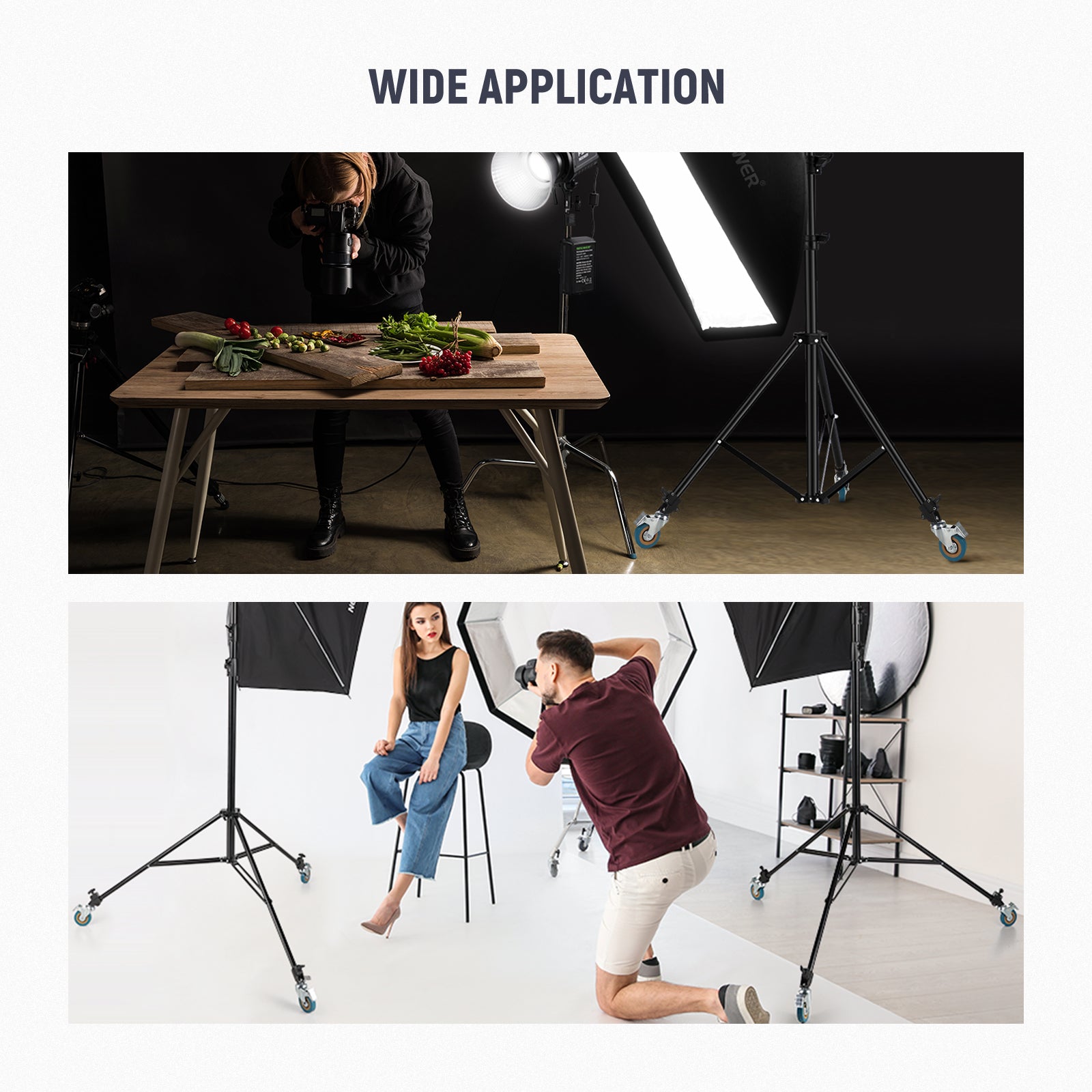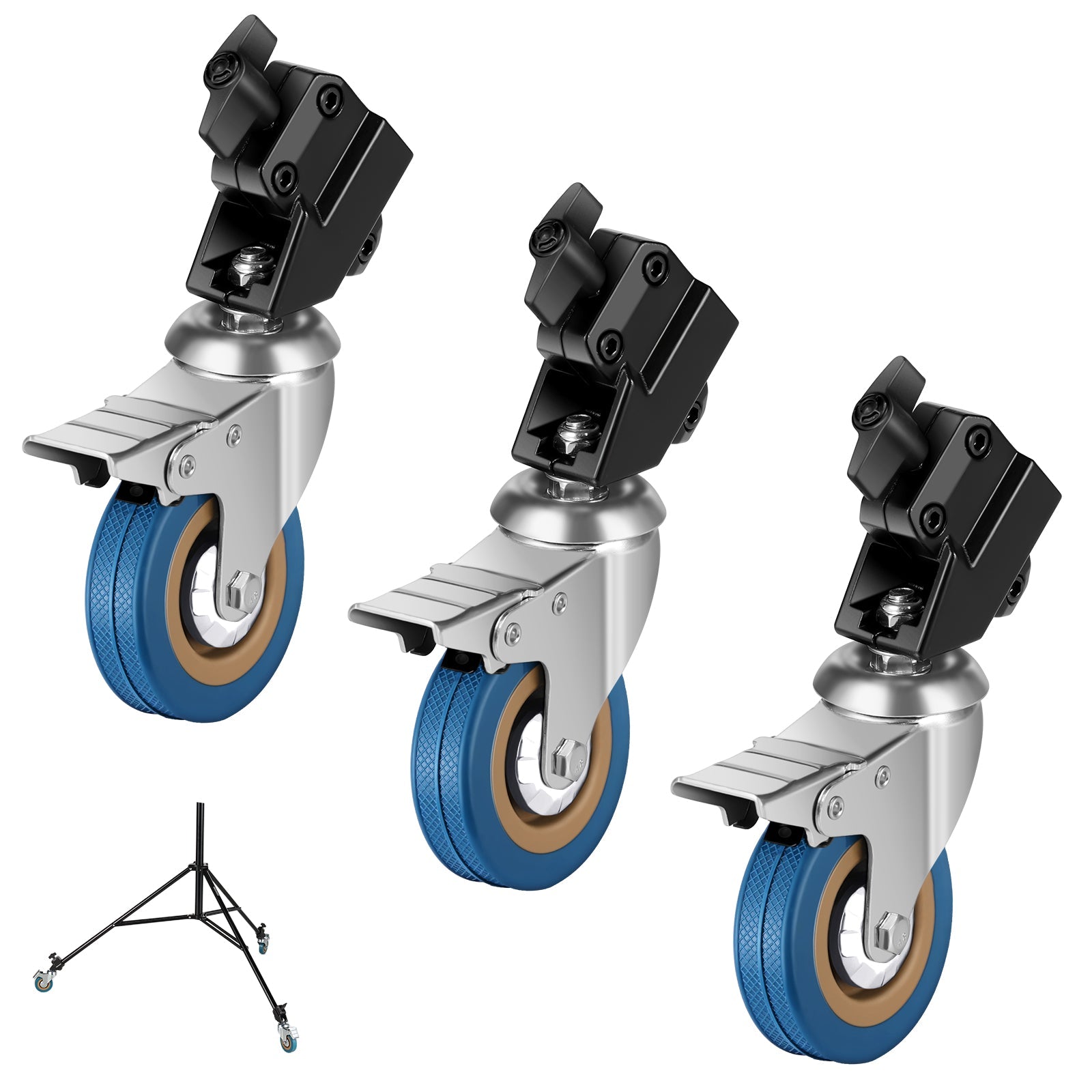 - 360° Swivel Caster Wheels- These 360° swivel casters are essential photography accessories that allow you to effortlessly roll a heavy stand on the ground and change its direction at any time. Offering both effortless mobility and stability, these tripod stand wheels simplify the process of positioning your light stand precisely where you require it