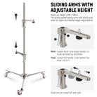 - More Versatile with Two Grips- Comes with two solid sliding arms with pistol grips, this rolling light stand enables you to mount two pieces of equipment at one time for an enhanced photography solution. Each removable and 360° rotatable arm features a 5/8" spigot stud with a 1/4" thread, compatible with SF30120Q/SF-RPBO26 softboxes, monolights, ring lights, CB60 RGB 70W/RGB1200 LED video lights, flash speedlights, reflectors, super clamps, magic arms, phone mounts, etc.