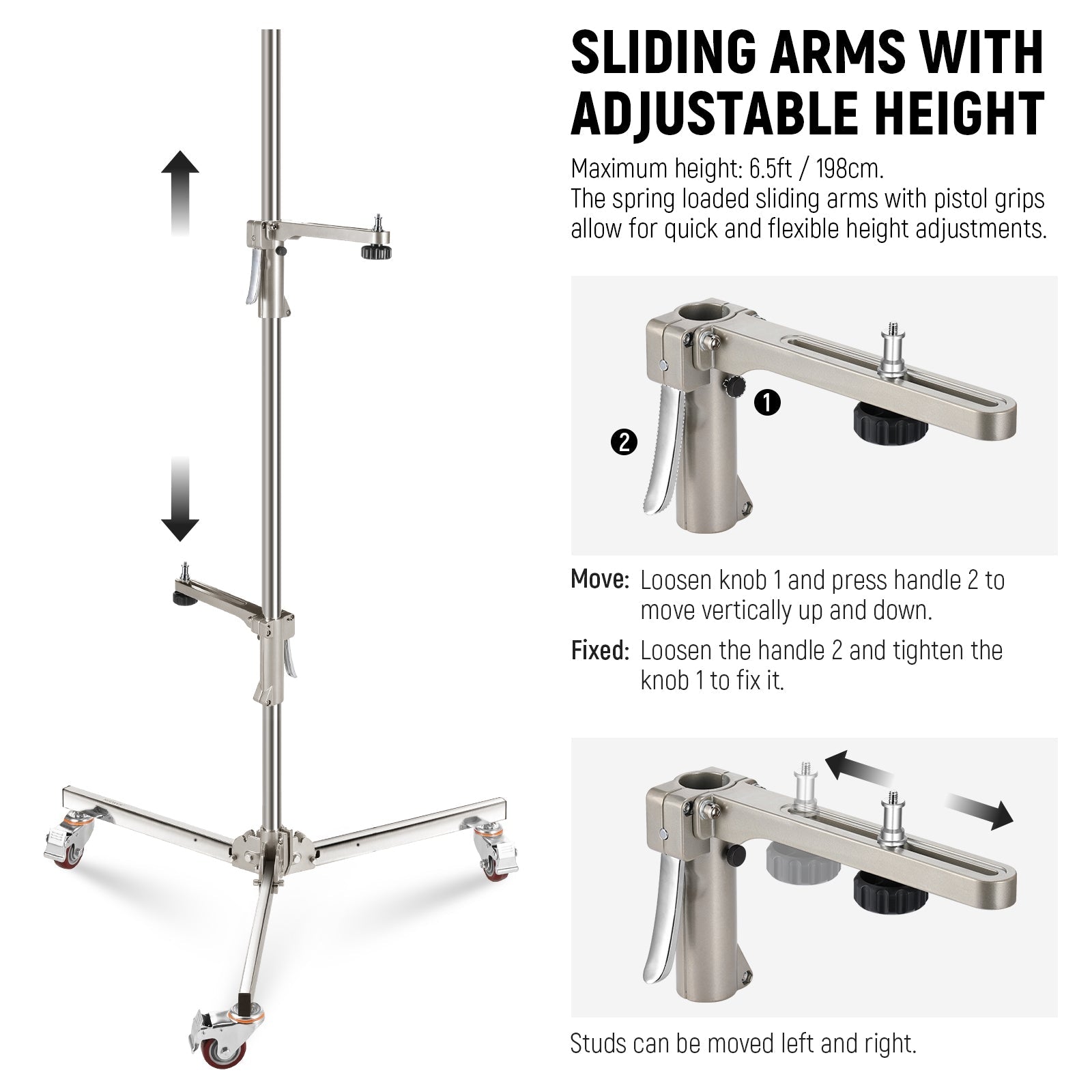 - Sliding Arms with Adjustable Height- This light stand has a maximum height of 6.5ft/198cm, meeting various photographic needs. The spring loaded sliding arms with pistol grips allow for quick and flexible height adjustments, enabling both vertical up and down movement. Release the spring trigger to secure and tighten the knob for added stability and safety