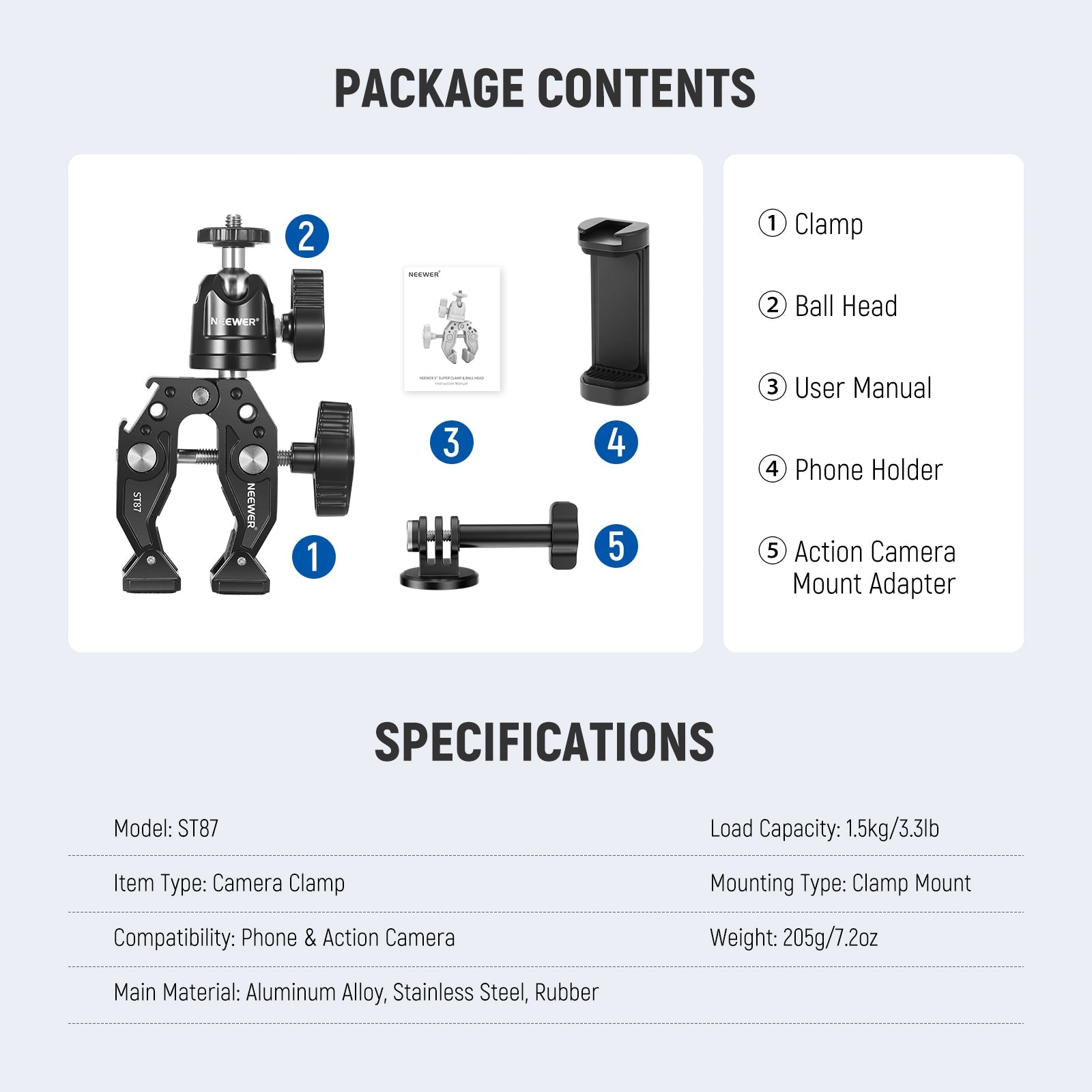 - Solid & Durable Material- Made of solid aluminum alloy, it is durable and versatile. It will stay tightly in your fixed position whether for work shooting or outdoor sports. The rubber pad inside the clamp enhances the grasp strength of clamp. The maximum load is 3.3 pounds (1.5KG)