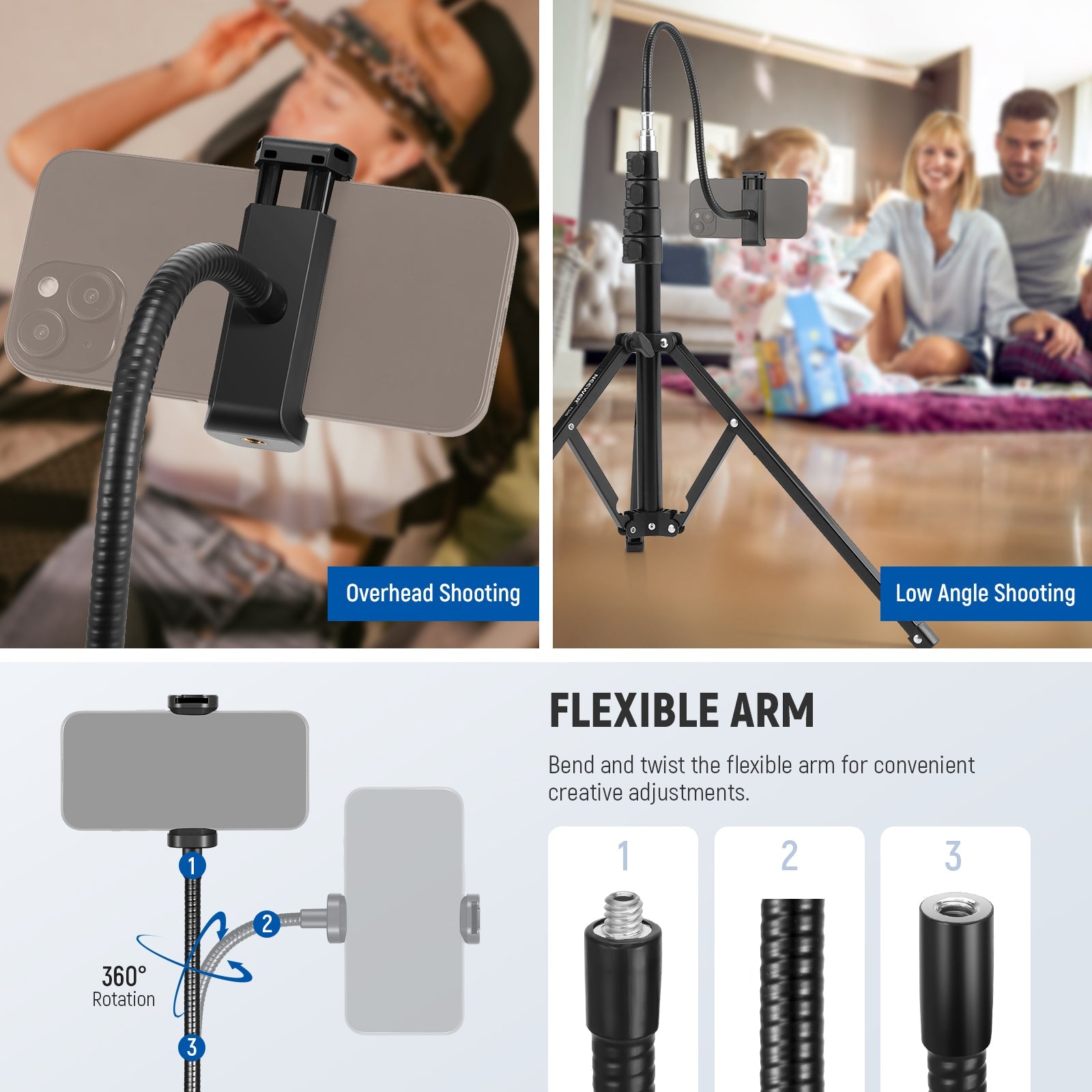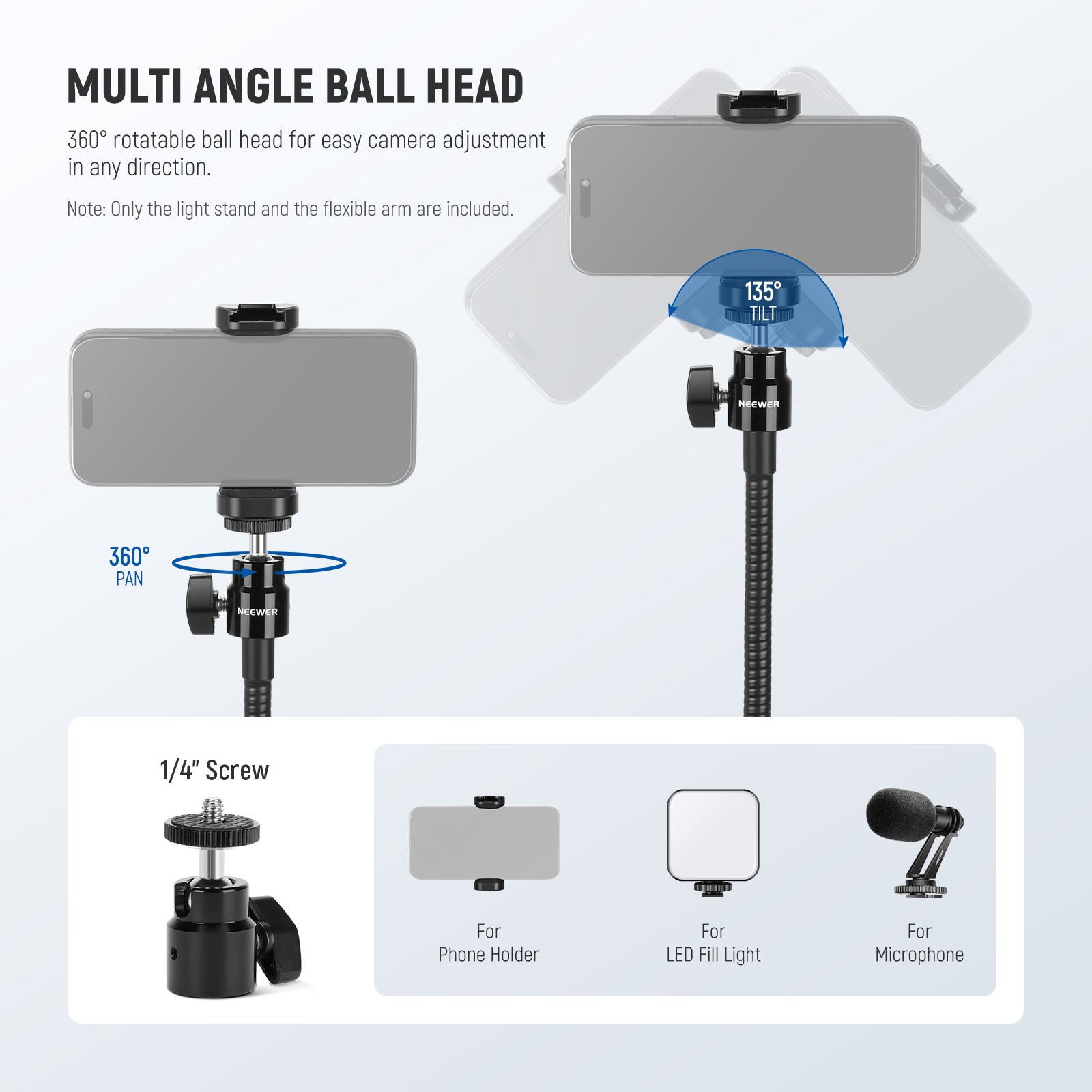 - 360° Ball Head & Flexible Arm- The 17.7"/45cm flexible arm introduces a remarkable level of adaptability that retains its shape even when bent, ensuring that your phone stays securely at any desired angle or height. The ball head enables smooth 360° rotation and tilt, and can be mounted at the top of the arm for more unique perspectives