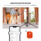 - Wireless Shutter Release- This shutter release (built in a long lasting CR2032 coin battery) allows you to wirelessly take pictures and videos via Bluetooth from up to 33ft/10m away - no need to reach your arm to the phone screen. Even the battery compartment comes with a secure cover that requires a coin to open, so children won't open it easily and accidentally swallow the battery