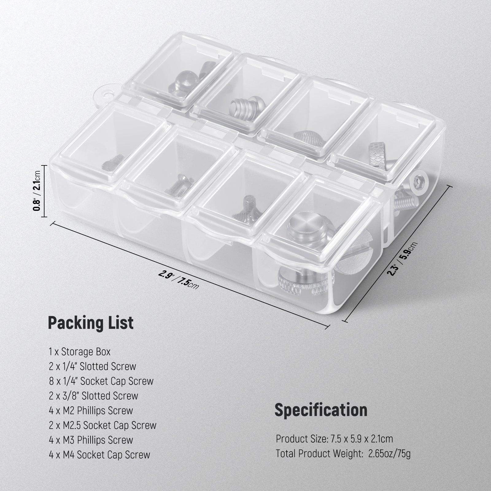 - Handy Photography Screw Set- Small camera accessories like screws get misplaced all the time. Get this camera mount screw set and always have spare screws at hand. Six kinds of screws included: 1/4", 3/8", M2, M2.5, M3, and M4 screws