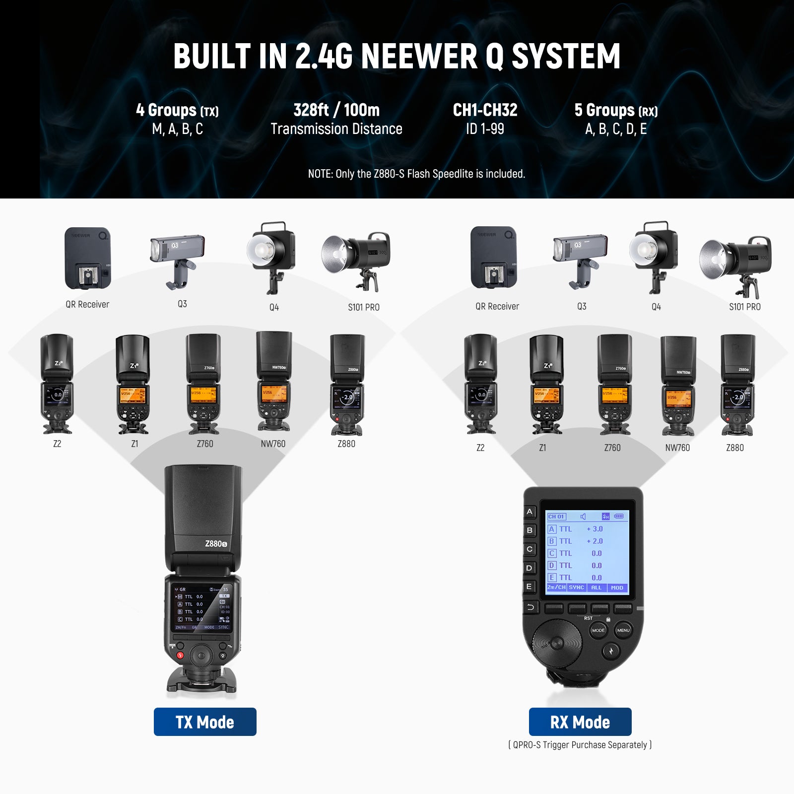 - Built In 2.4G Wireless Q System- With NEEWER 2.4G Q System, the flash has 4 master groups (M/A/B/C), 5 slave groups (A/B/C/D/E, D/E for QPro triggers), 32 channels (1-32), and 99 IDs (1-99), compatible with the QPro-N Trigger (sold separately) for wireless flash control. It can work as a master/slave unit for other Q system flashes and allows wireless flash sync within 328'/100m (no obstacles)