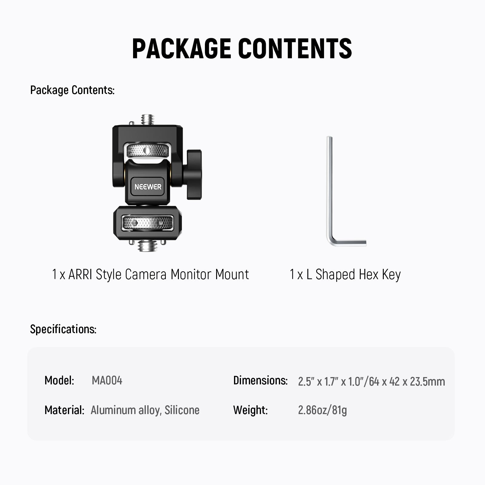 ARRI Style Camera Monitor Mount- Designed to effortlessly and securely mount 5"~7" camera monitors on the top of the camera cage (like NEEWER CA011, CA004, CA002). The bottom 3/8" knurled thumbscrew with ARRI locating pins can be easily tightened by hand. Seamless compatibility with SmallRig camera cages, video rigs, top handle, and compatible with small rig other accessories