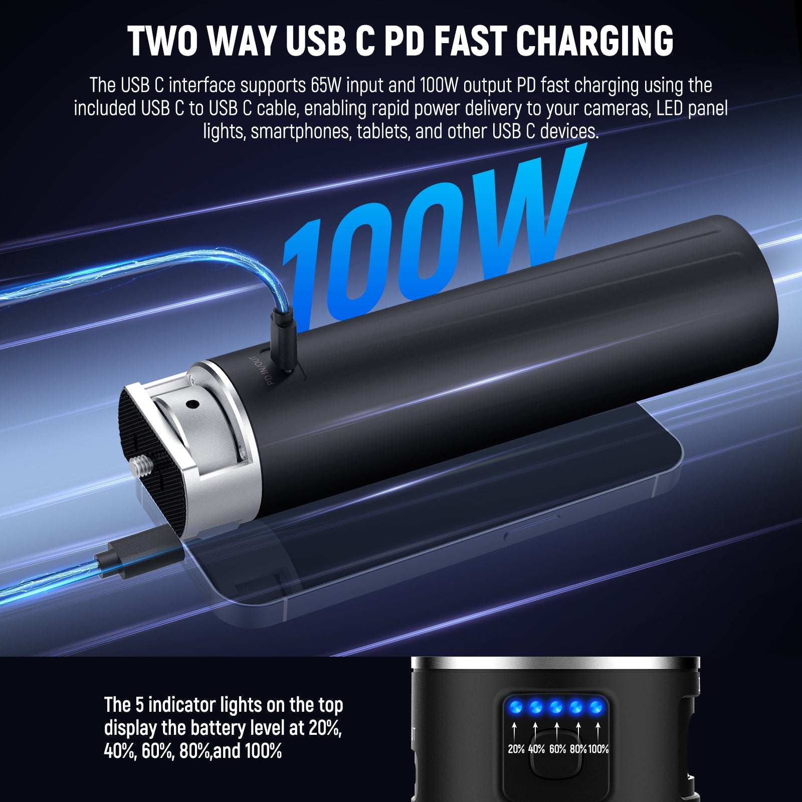 - Two Way USB C PD Fast Charging- The USB C interface supports 65W input and 100W output PD fast charging using the included USB C to USB C cable, enabling rapid power delivery to your cameras, LED panel lights, smartphones, tablets, and other USB C devices. It offers adjustable current levels to match the needs of different devices for optimal charging