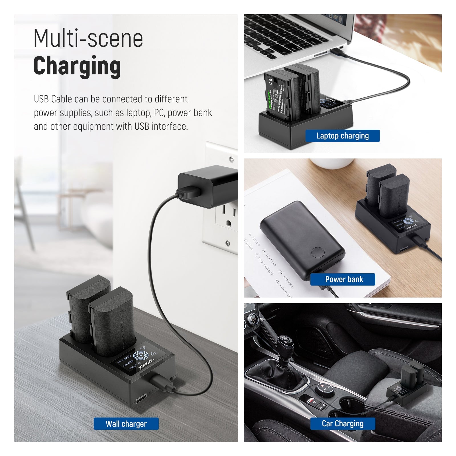- Wide Compatibility- Two LP-E6NH batteries are compatible with Canon EOS 5D Mark II, 5D Mark III, 5D Mark IV, 5DS, 5DSR, 6D, 6D Mark II, 7D, 7D Mark II, 60D, 70D, 80D, 90D, R, Ra, R5, R6, R7 and more. The charger is compatible with LP-E6, LP-E6N, and LP-E6NH batteries