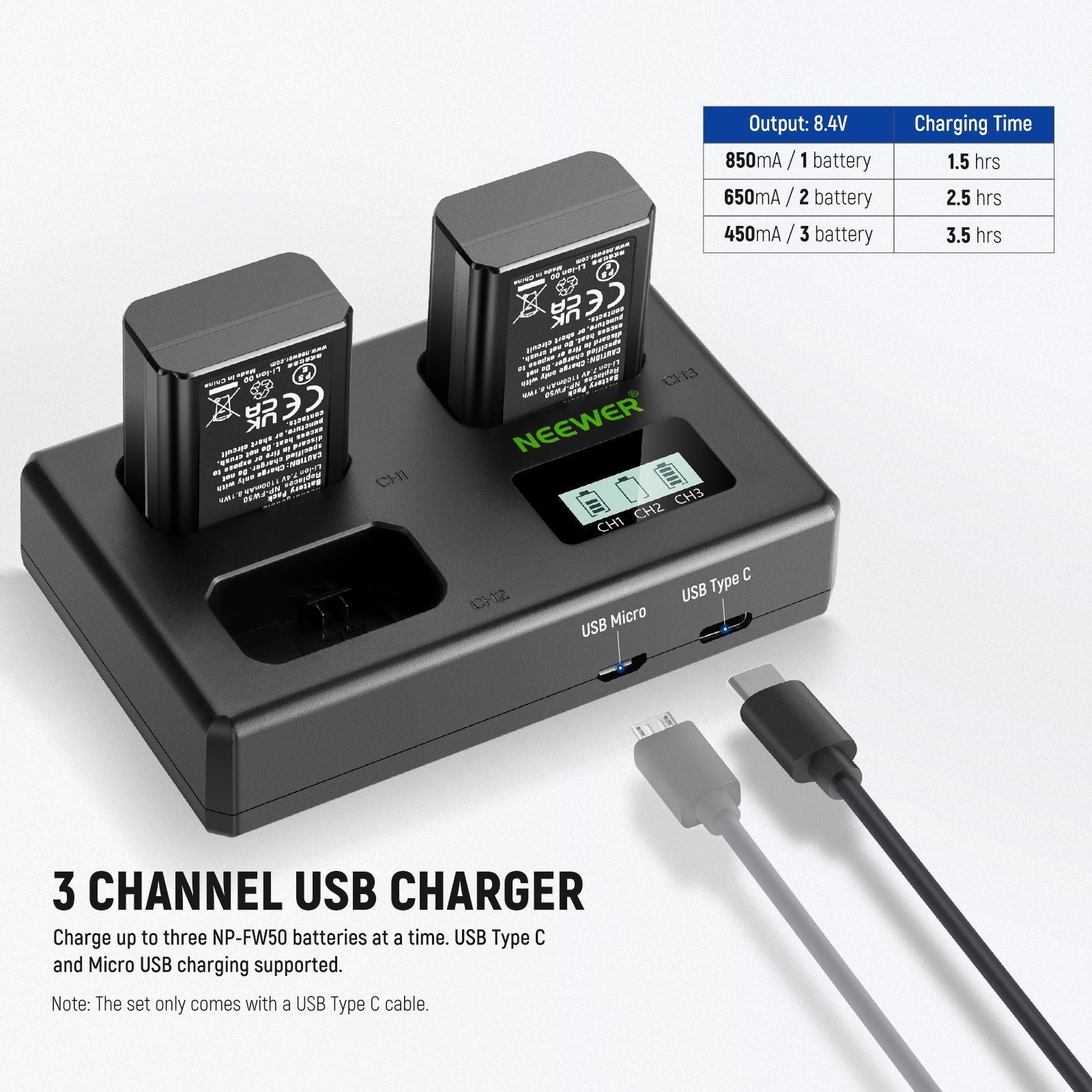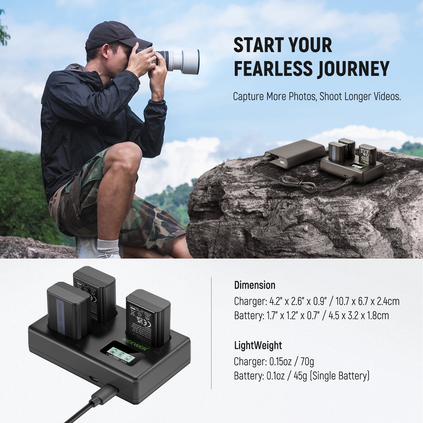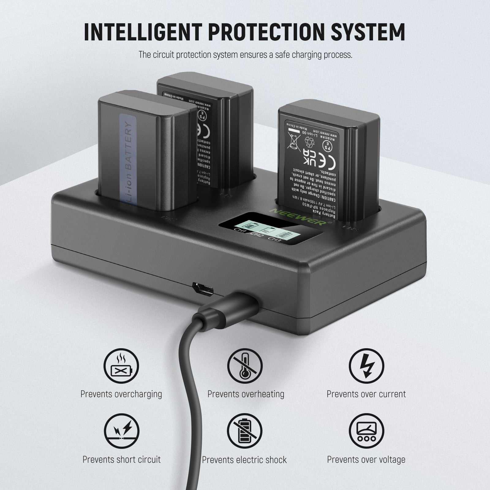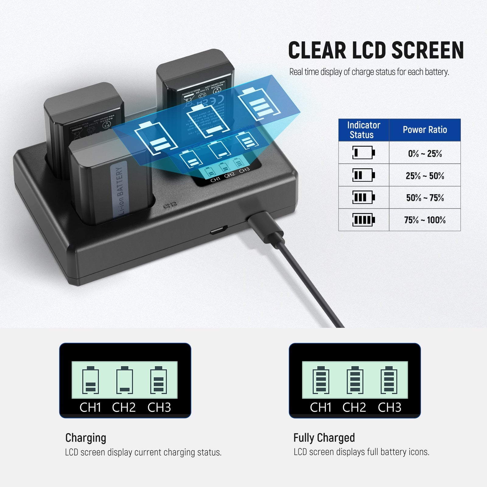 • Triple Slot USB Charger- This triple USB charger allows you to simultaneously charge 3 batteries at home, at the office, or on the go. A backlit LCD screen makes you understand the current charging status of each battery, even in the darkness