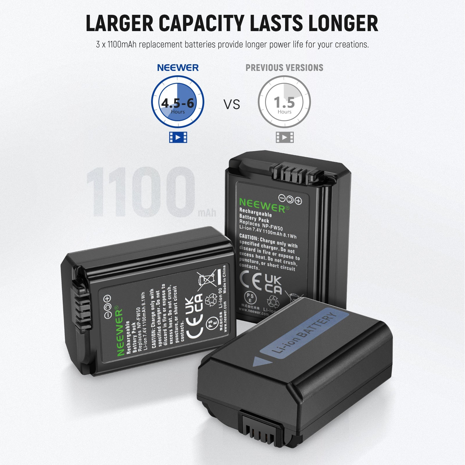 • Reliable Power for Your Camera- Three 1100mAh replacement batteries for NP-FW50 provide abundant battery power for photographers, vloggers and filmmakers who work on outdoor creation and help them capture every precious moment. NOTE: For optimal battery longevity, please fully charge the battery before first use