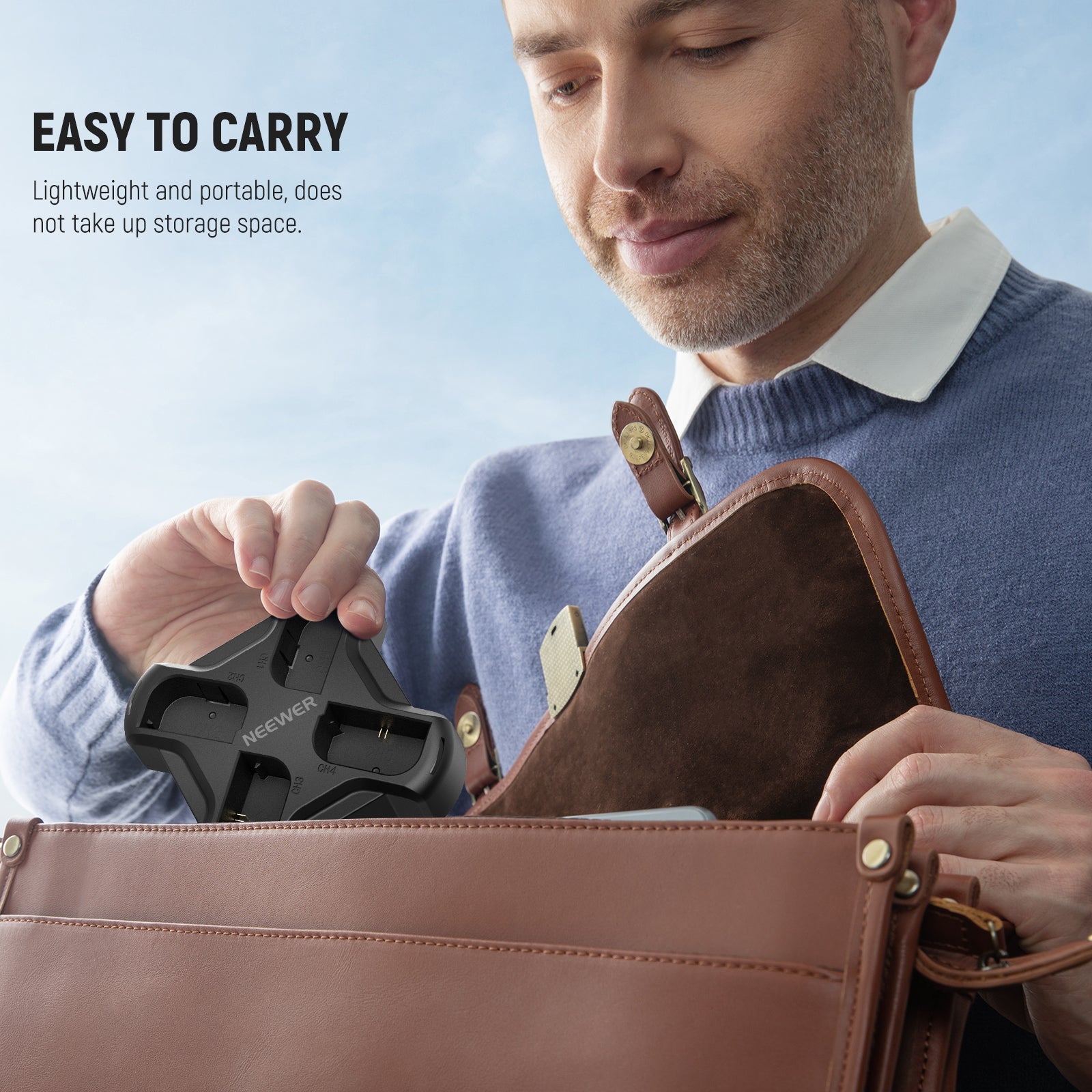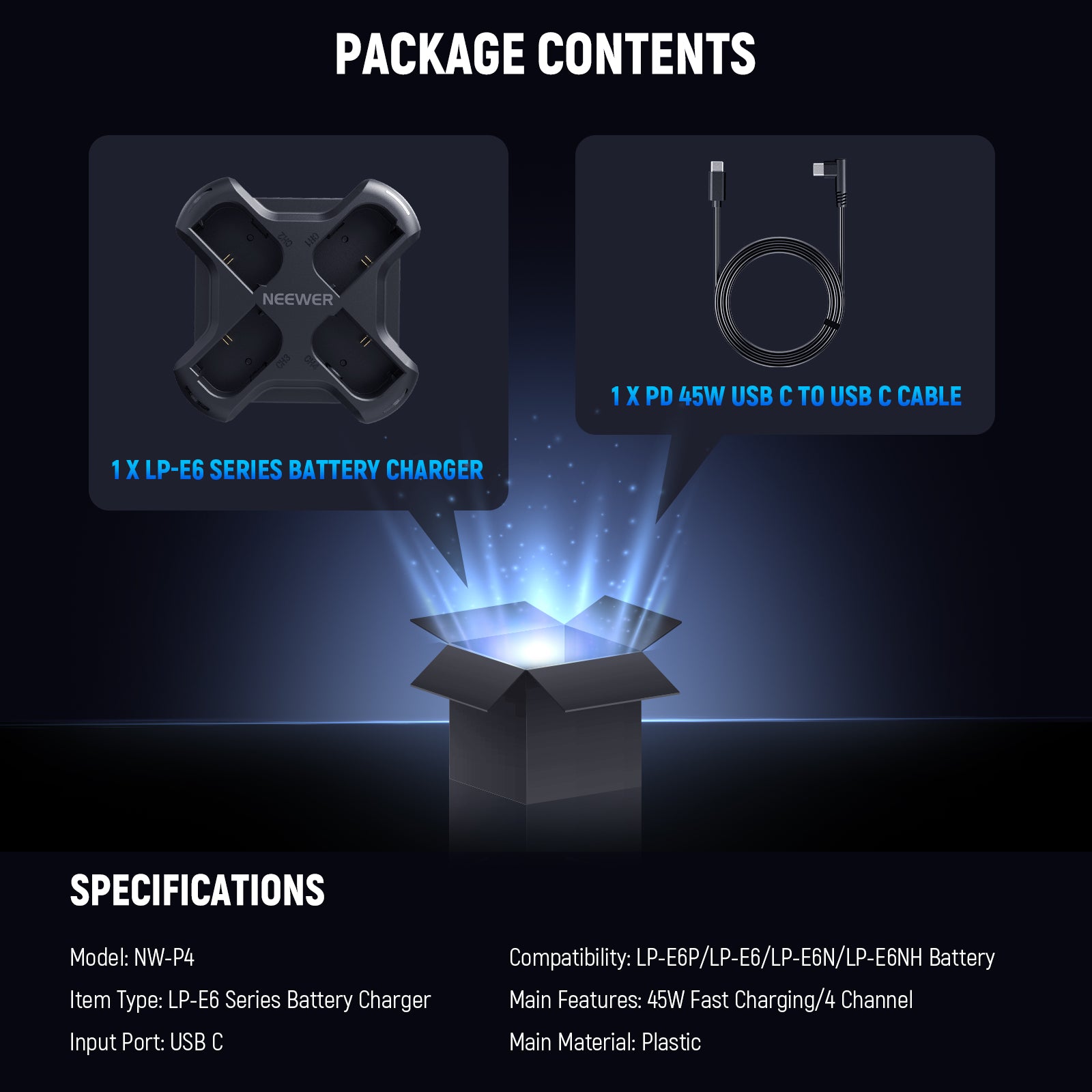 - For LP-E6 Series Batteries- NEEWER NW-P4 four channel battery charger is designed to simultaneously recharge four LP-E6, LP-E6N, LP-E6NH, or LP-E6P batteries, providing an efficient and reliable power backup for continuous shooting compatible with Canon EOS R5 Mark II 6D/6D Mark II 5D Mark III 5D Mark IV cameras, and more. Note: Recommended to use with NEEWER PD200W0500G4T 100W GaN charger for optimal efficiency