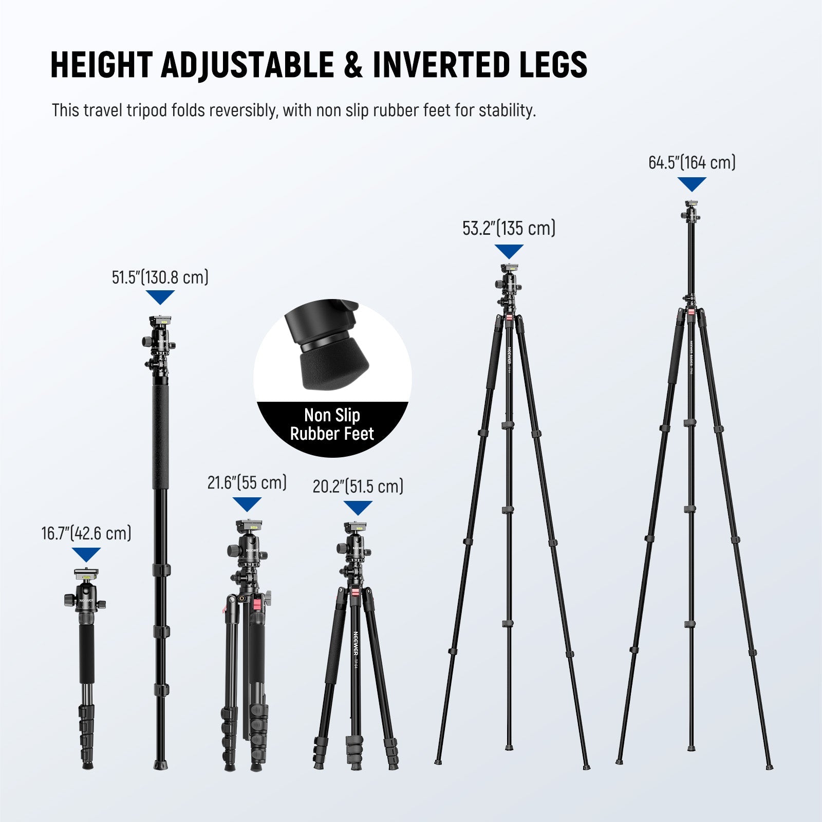 - Smooth & Secure Height Adjustment- Featuring 5 section foldable legs, this professional heavy duty travel tripod for smartphone & camera extends up to 64.5"/164cm and can be effortlessly adjusted and securely locked using flip locks. Its flexible height and angle settings enable versatile overhead compositions for creative shooting. Easily detach one leg to convert the tripod into a monopod for photography and videography