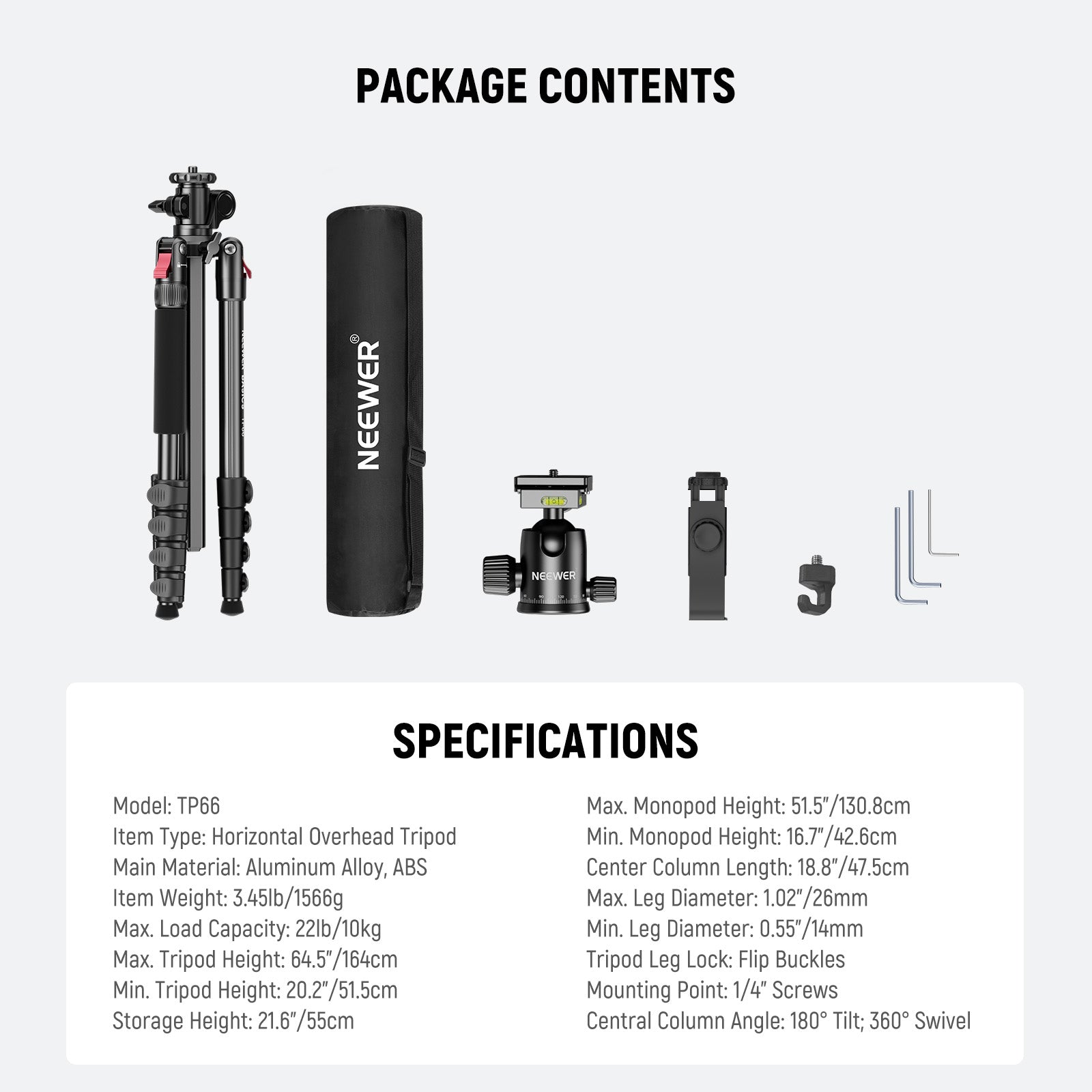 - Introducing NEEWER BASICS- Simple and practical, NEEWER BASICS is an economical product line that focuses on essential functions and designs, without unnecessary extras and materials. The TP66 is a portable yet powerful horizontal overhead tripod (20.2"-64.5"/51.5-164cm), supporting up to 22lb/10kg of gear and allowing 360° pan and 180° tilt. The tripod can also be converted into a monopod (16.7"-51.5"/42.6-130.8cm) to meet various scenarios