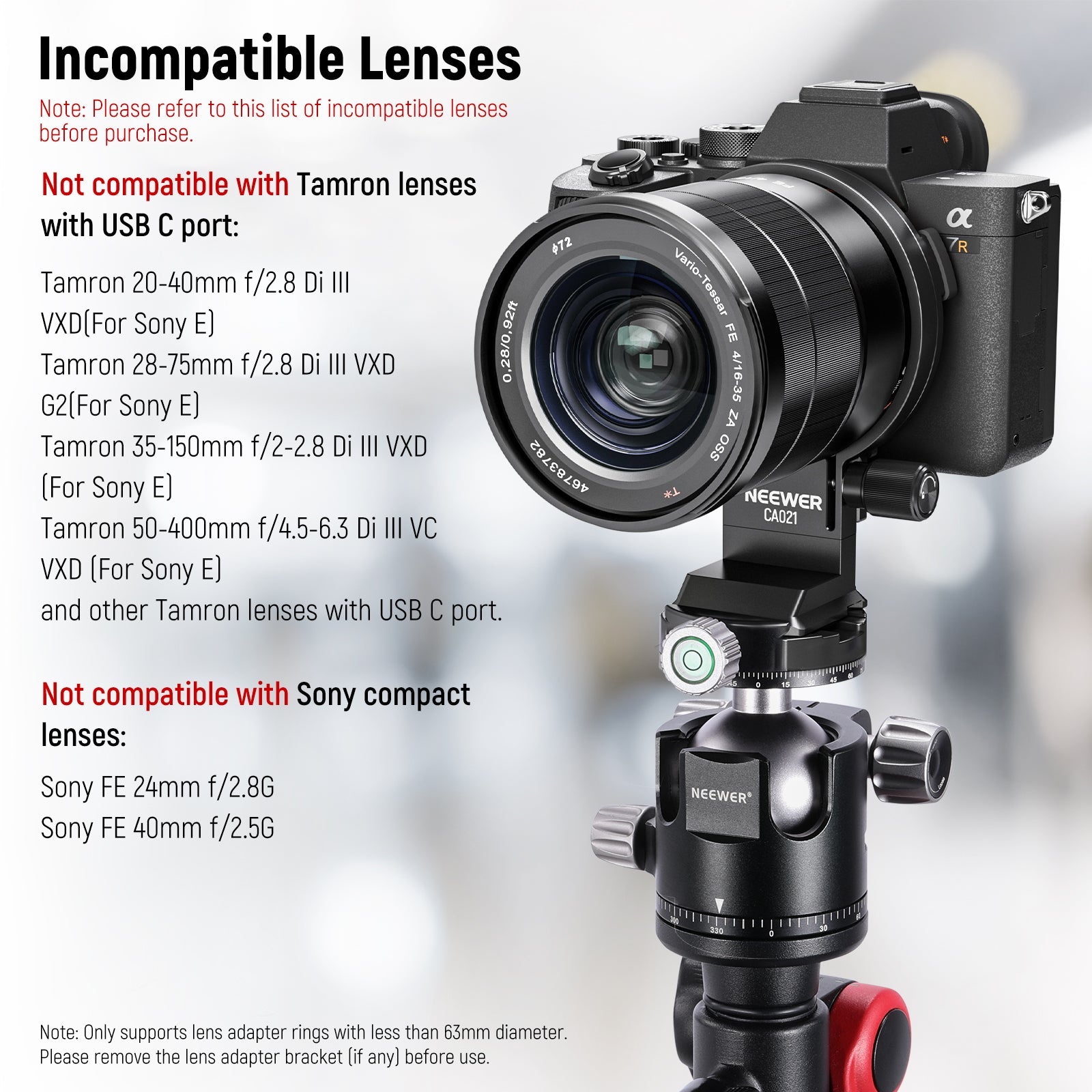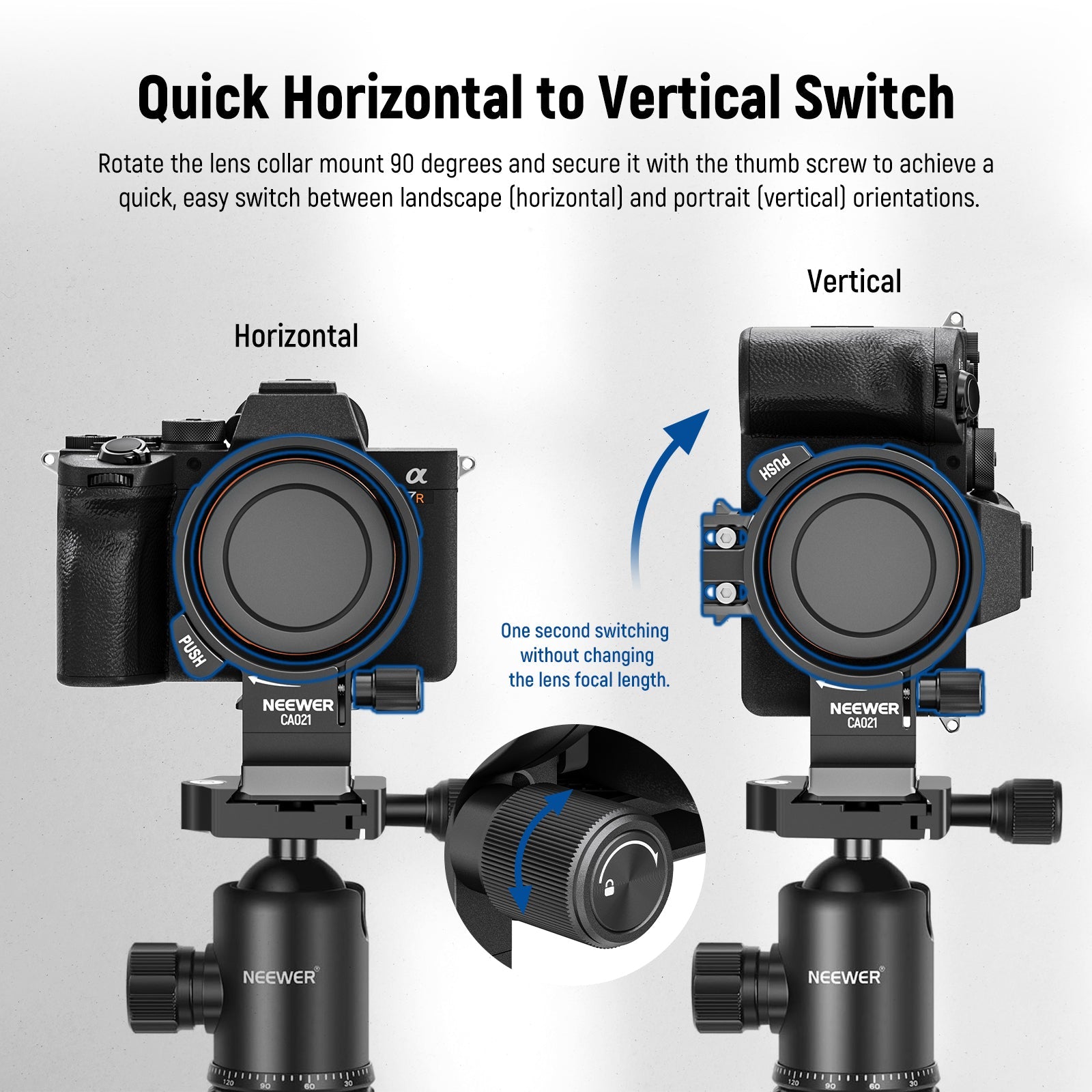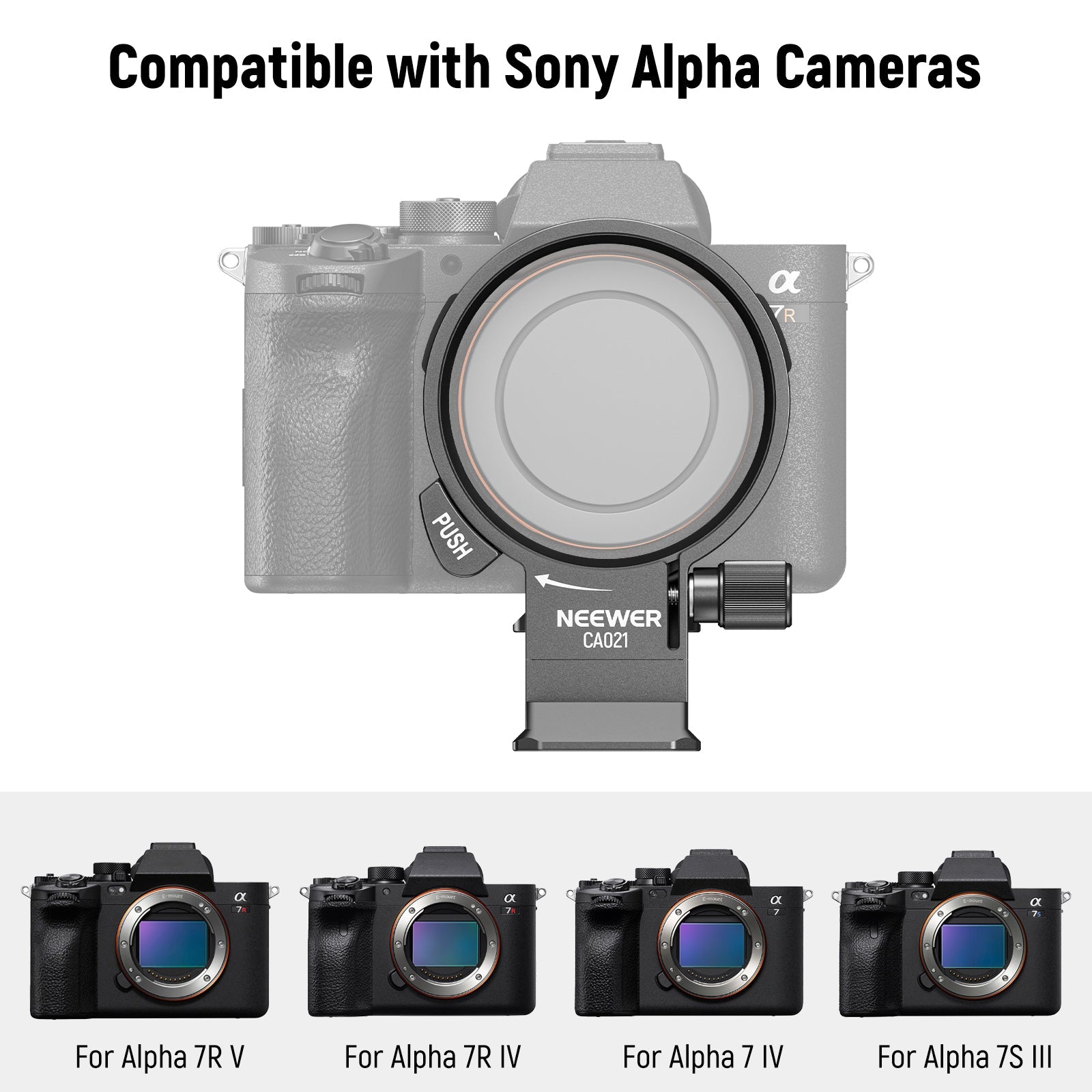 - Formfitting Design- This NEEWER CA021 rotatable collar camera base plate, made of CNC anodized aluminum alloy, is fully compatible with Sony Alpha 7R IV Alpha 7R V Alpha 7 IV Alpha 7S III. It enhances balance when using telephoto lenses, enables seamless switching between horizontal and vertical shots, and allows full access to the camera's LCD flip screen, ports, and functions while securely mounted on a tripod