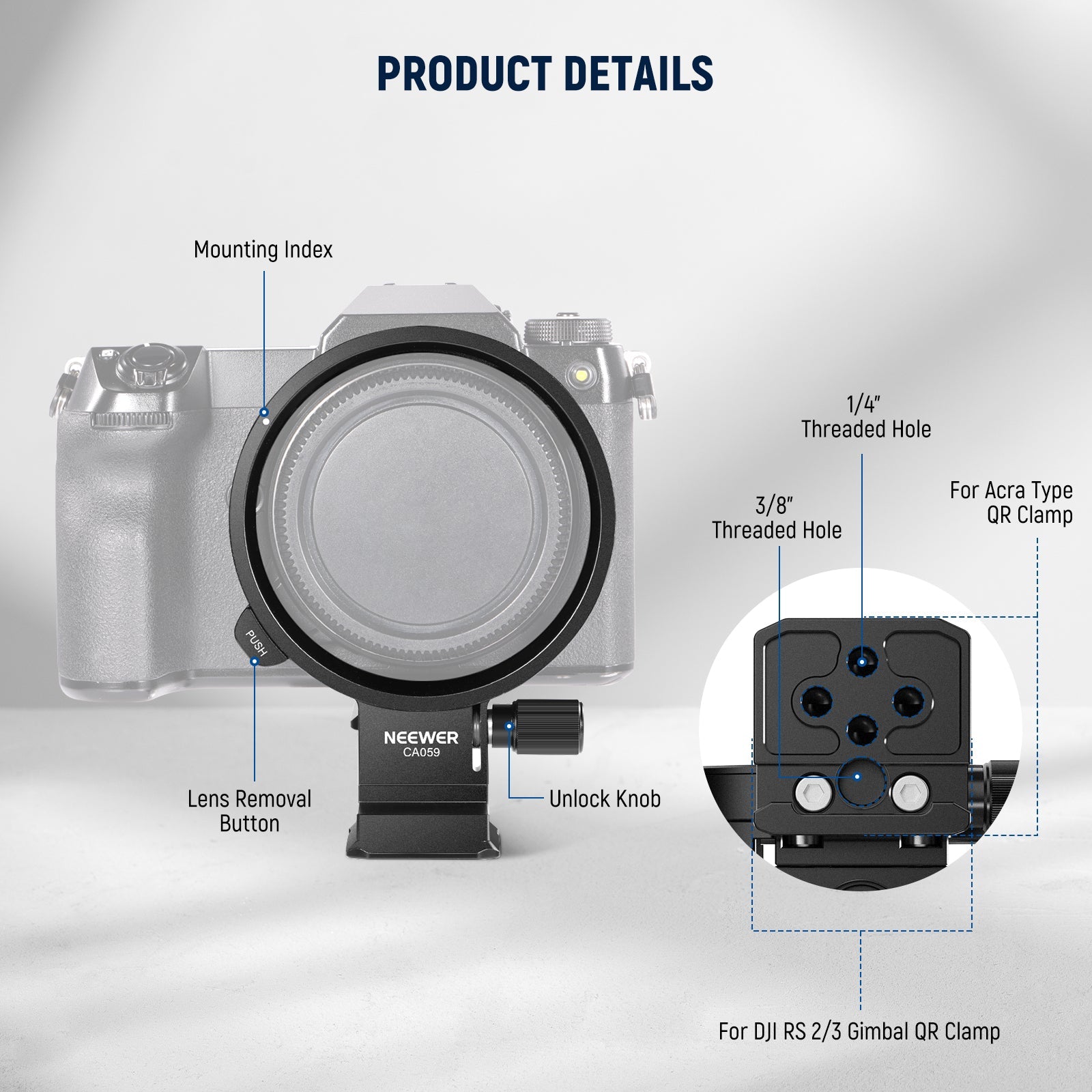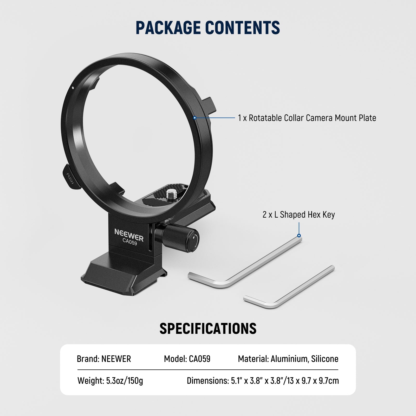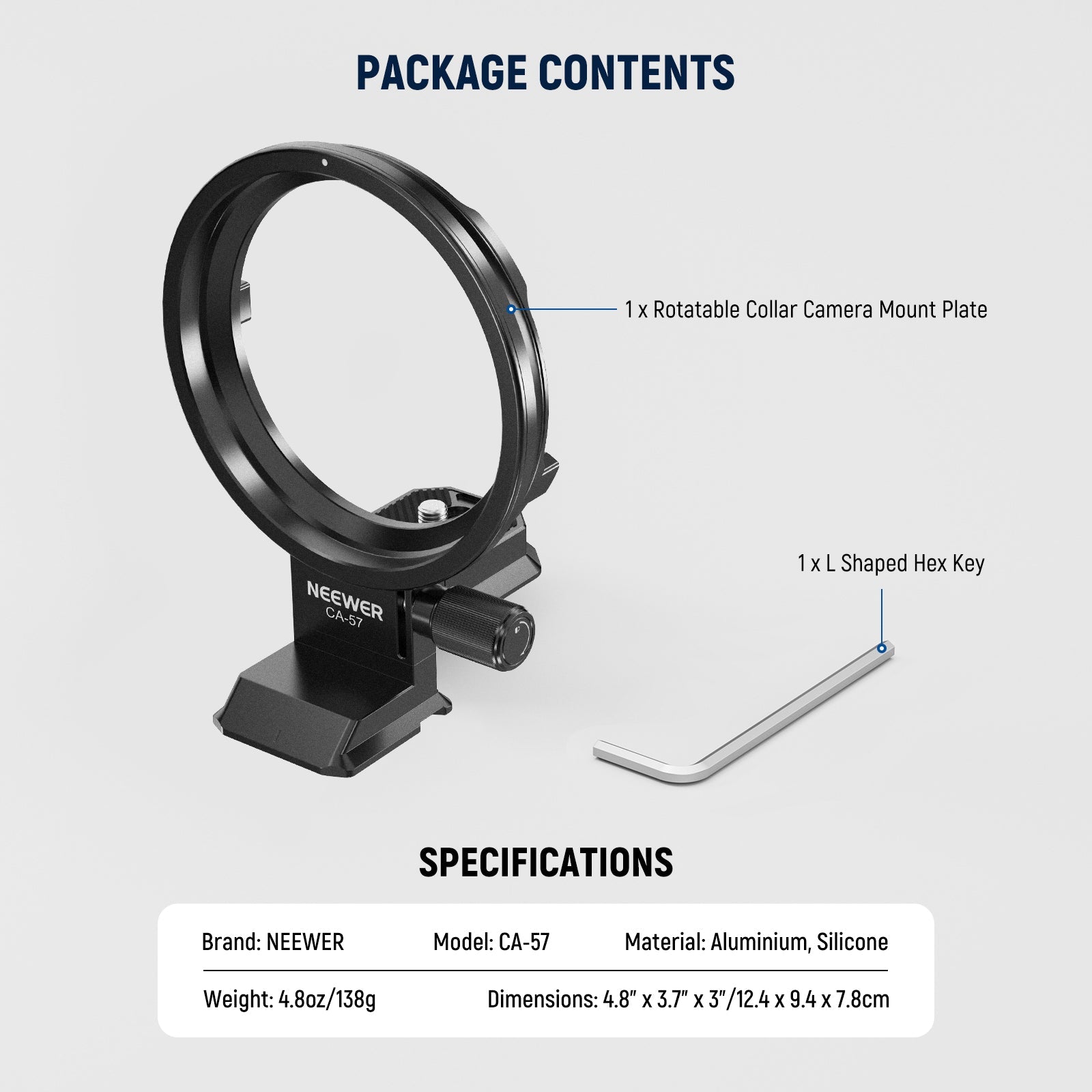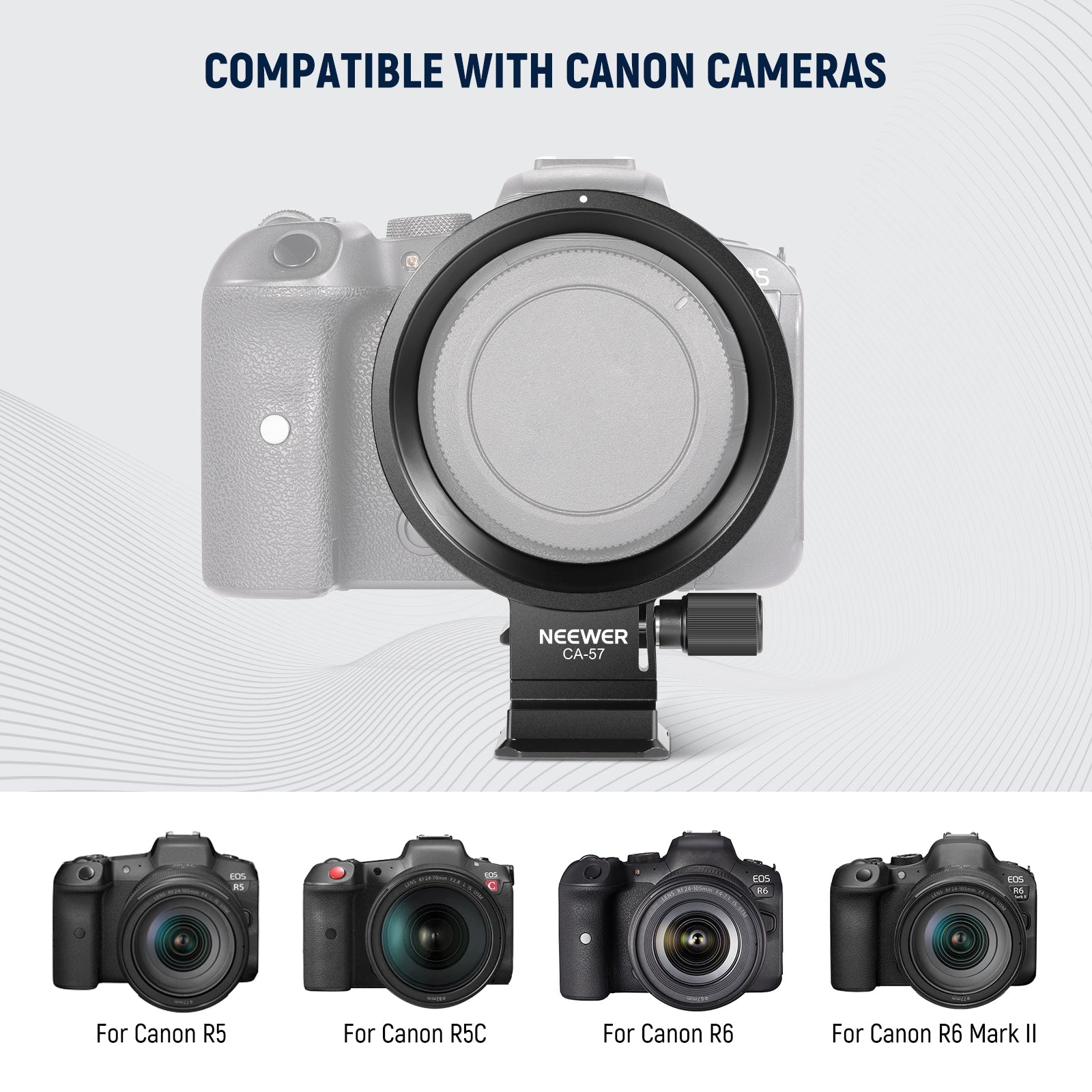 - Flexible Angles & Improved Balance- This NEEWER CA-57 rotatable collar camera mount plate enables seamless quick horizontal to vertical shots with superior stability, and improves balance when using heavy lenses. Compatible with Canon R5 / R5C / R6 / R6 Mark II full frame cameras, compatible with Canon EF EOS R mount adapter and control ring mount adapter, compatible with RF 24-70mm f/2.8 24-105mm f/4 24-105mm f/4-7.1 85mm f/2 50mm f/1.2 100-400mm f/5.6-8 15-35mm f/2.8 100mm f/2.8 camera lenses