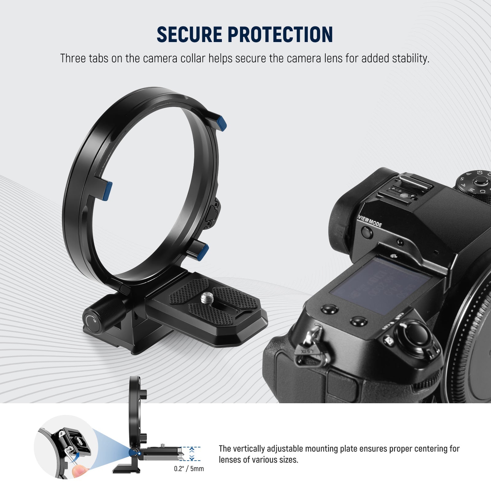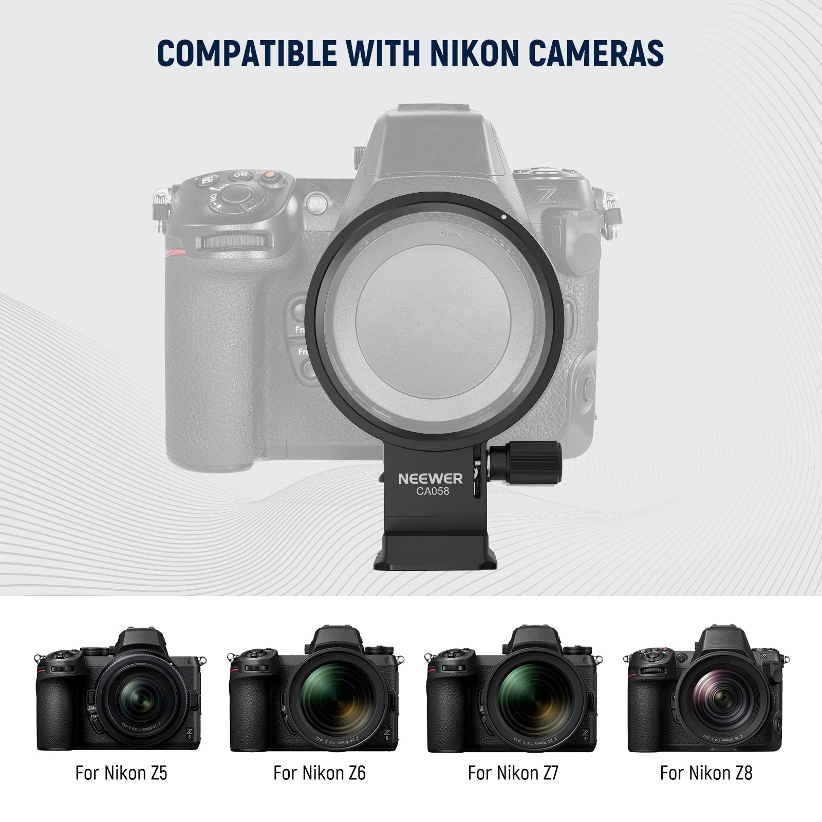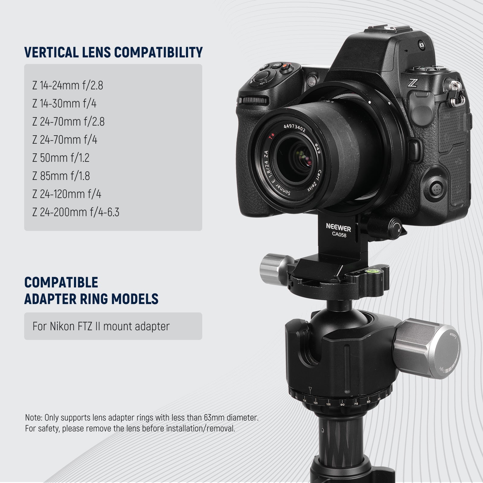 - Flexible Angles & Improved Balance- This NEEWER CA058 rotatable collar camera mount plate seamless quick horizontal to vertical shots without compromising stability, and enhances balance when using telephoto or other heavy lenses. Compatible with Nikon Z8 Z7 II Z6 II Z5 cameras FTZ II mount adapter Z 24-70mm f/2.8 50mm f/1.2 24-120mm f/4 14-24mm f/2.8 85mm f/1.8 24-70mm f/4 14-30mm f/4 24-200mm f/4-6.3 lenses. Note: not compatible with Z 70-200mm f2.8