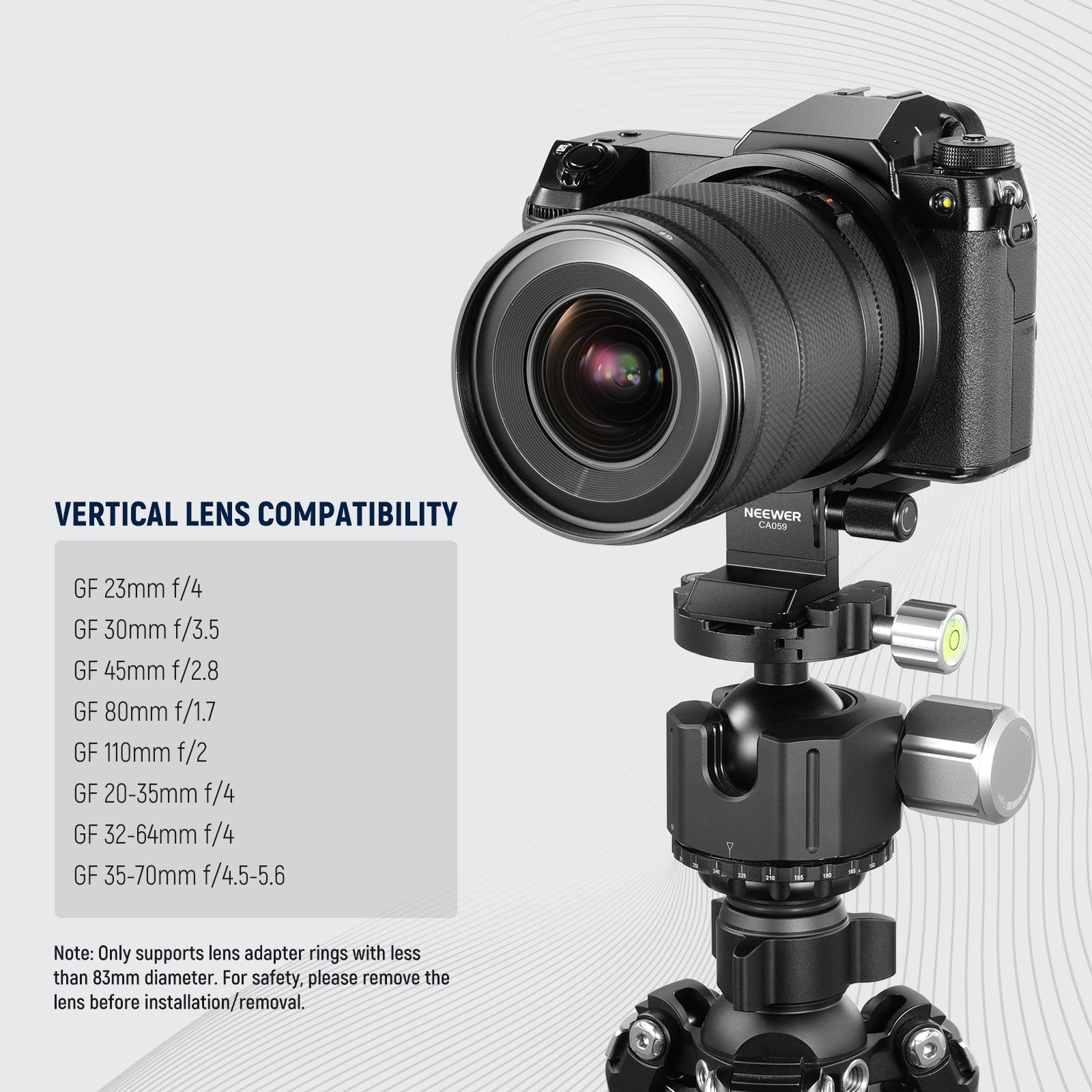 - Flexible Angles & Improved Balance- This NEEWER CA059 rotatable collar camera mounting plate enables seamless quick horizontal to vertical shots without compromising stability and enhances balance when using telephoto or other heavy lenses. Compatible with Fujifilm GFX 100S / GFX 50S II/ GFX100 II medium format cameras, compatible with GF 20-35mm f/4 110mm f/2 23mm f/4 35-70mm f/4.5-5.6 45mm f/2.8 30mm f/3.5 80mm f/1.7 32-64mm f/4 camera lenses