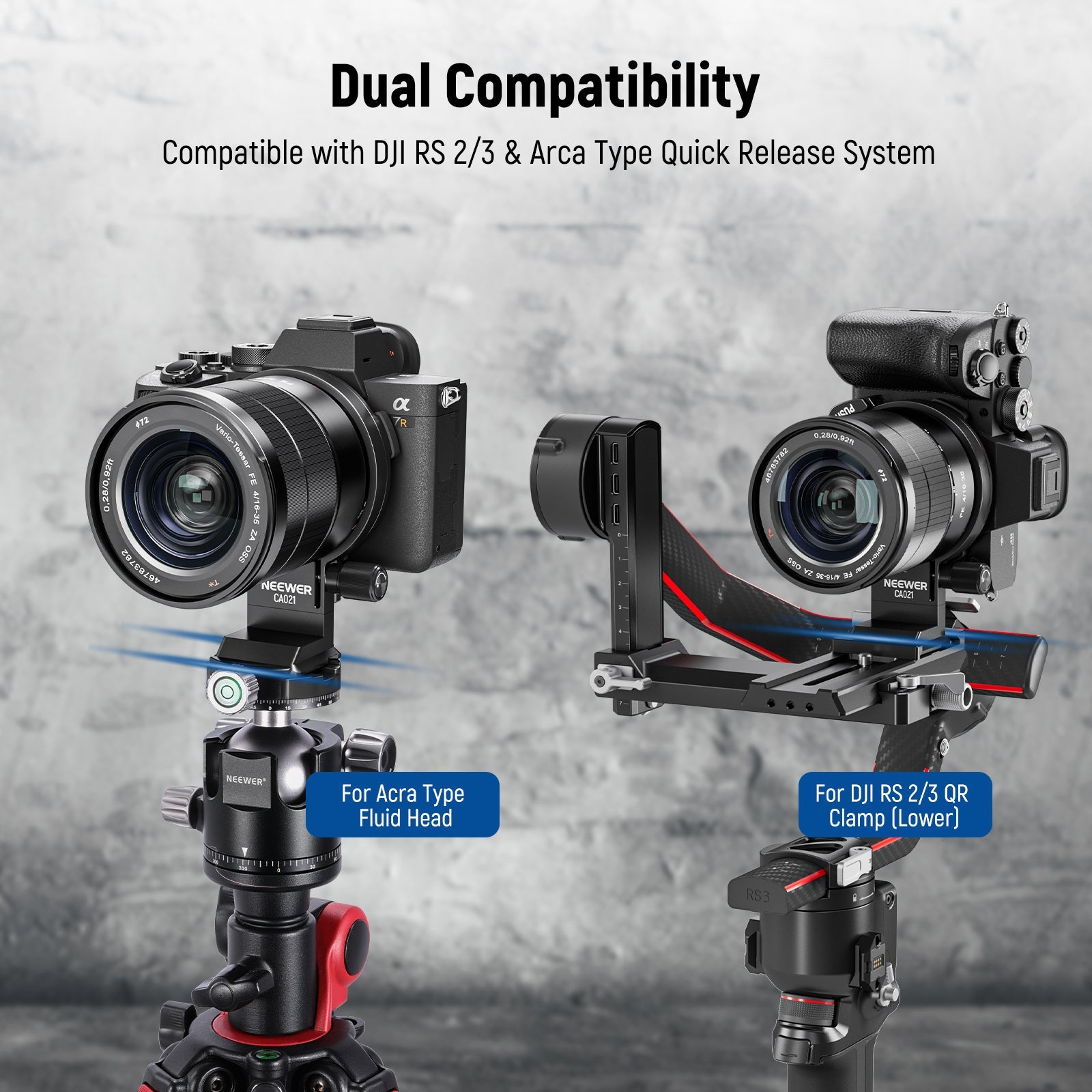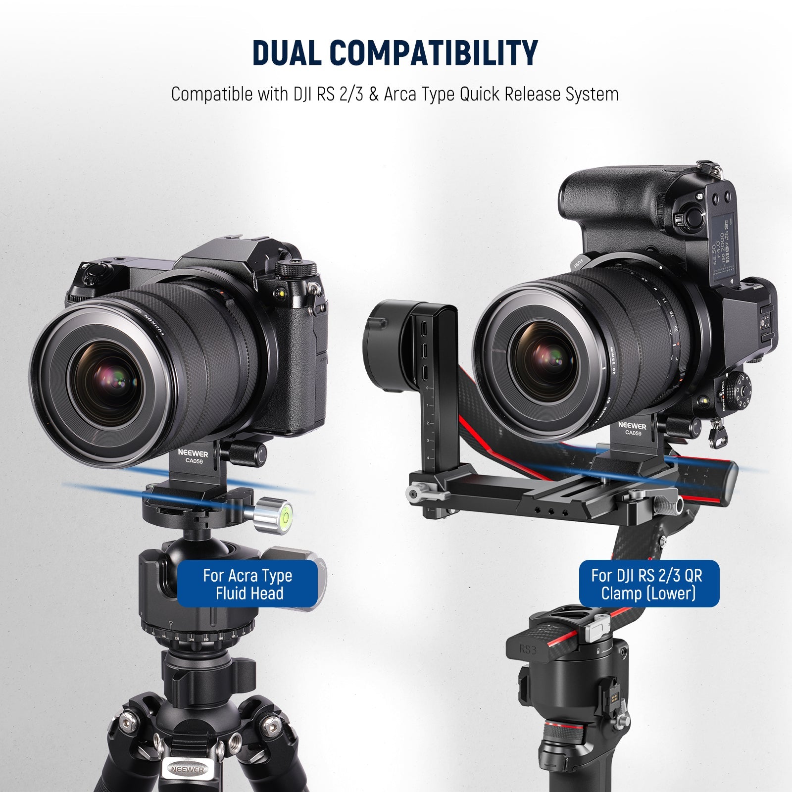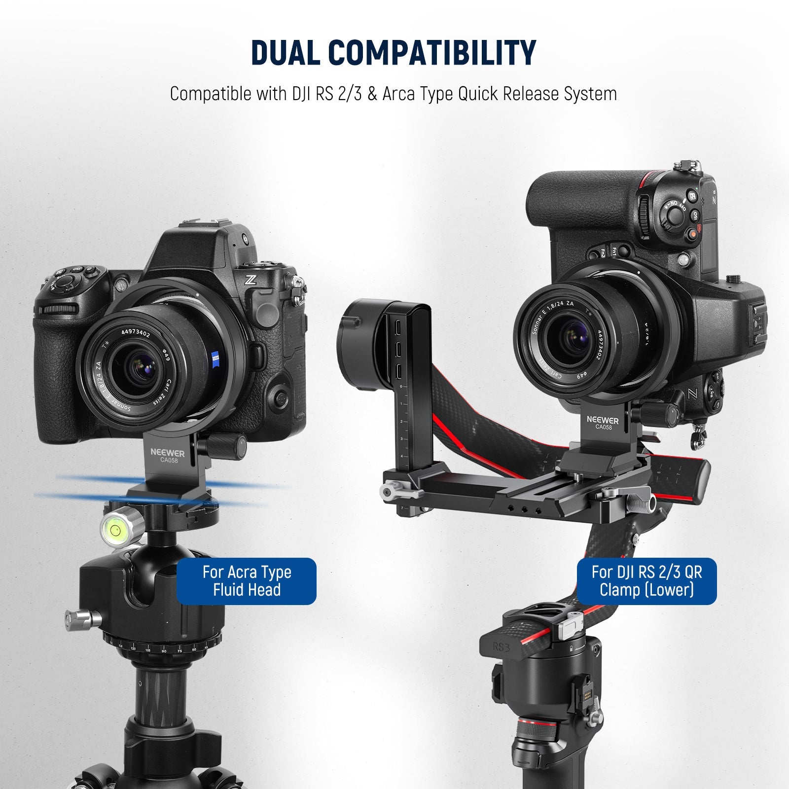 - Quick Release Camera Mounting- This vertical camera tripod lens mount is equipped with a quick release base plate that is both compatible with Arca Swiss DJI RS3 Pro RS3 Mini RS3 RS2 Pro RS2 vertical camera mount, and easily installed on any tripod, gimbal stablizer, monopod, and camera slider with an identical mounting system. The 4 x 1/4" and 1 x 3/8" threads on the bracket bottom for camera rigs, hand grips, magic arms and more
