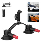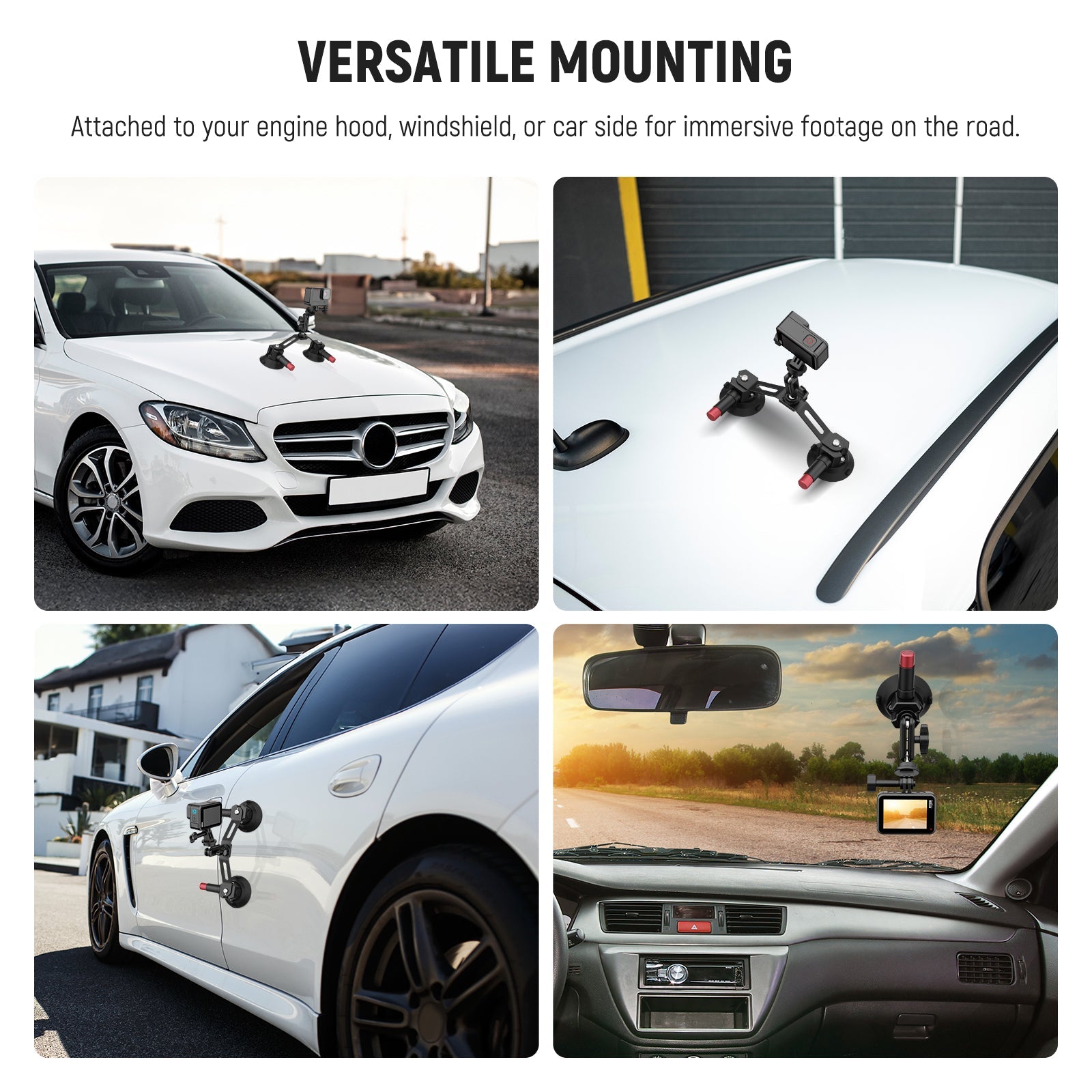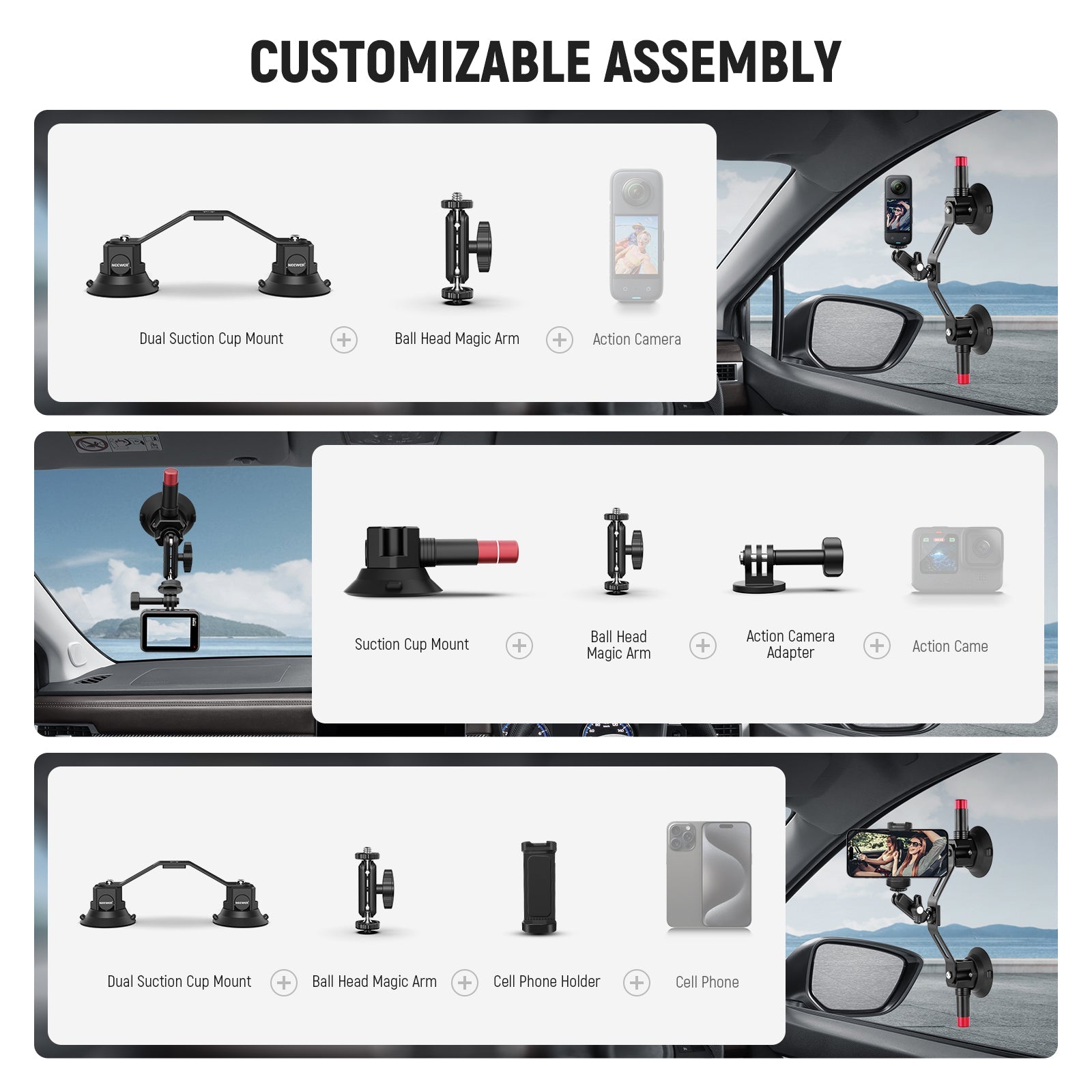 - Dual Suction Cup Car Mount Kit- Capture unique driving angles from your engine hood, windshield inside/outside, dash, or car side for immersive POV footage on the road. This suction cup car mount securely attaches your action camera (adapter included) or smartphone (phone holder included) with two powerful suction cups, and enables flexible positioning with the dual ball head magic arm for diverse video recording perspectives. Note to use at speeds below 80 km/h to prevent accidental drops