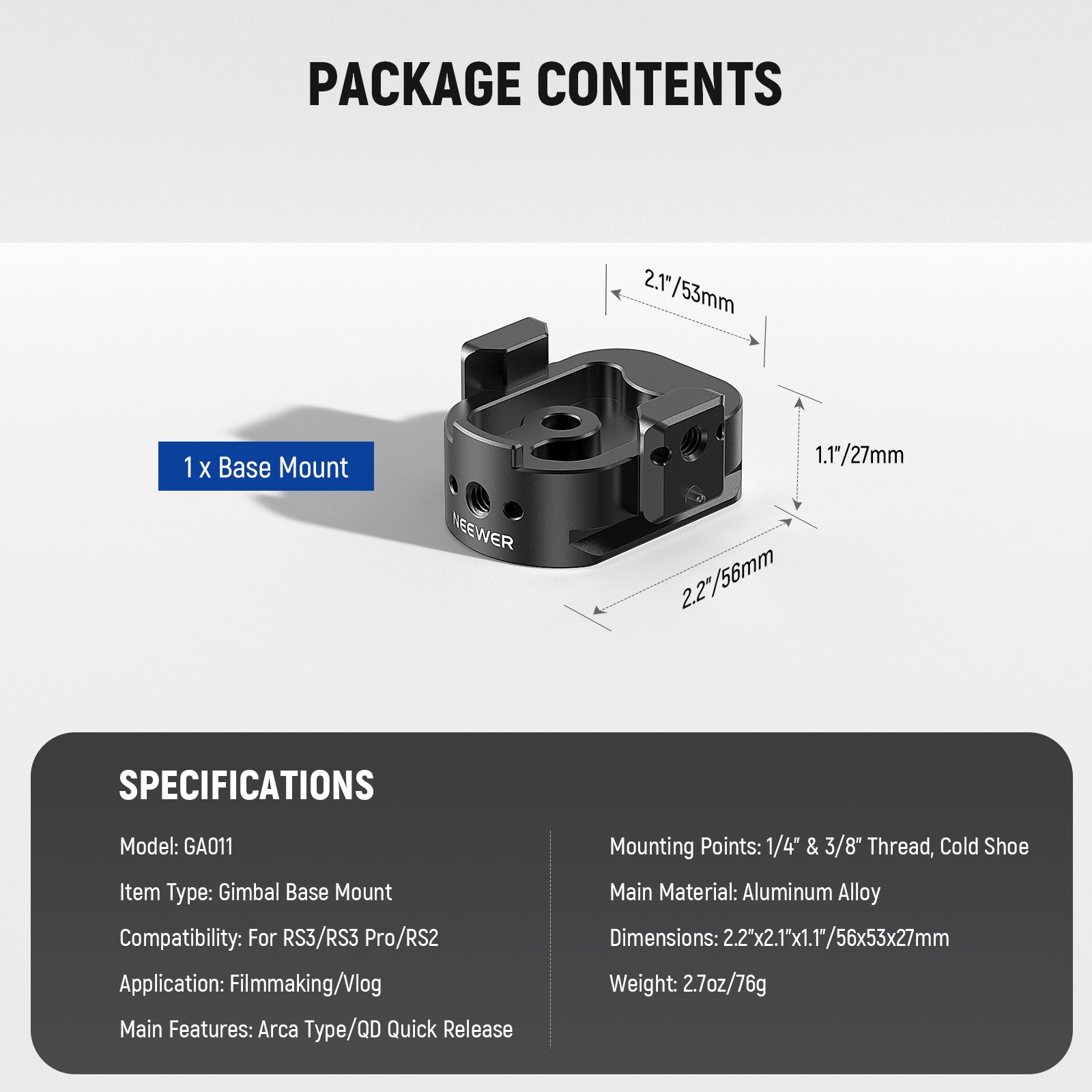 - 1 x Base Mount for RS4/RS4 Pro/RS3/RS3 Pro/RS2