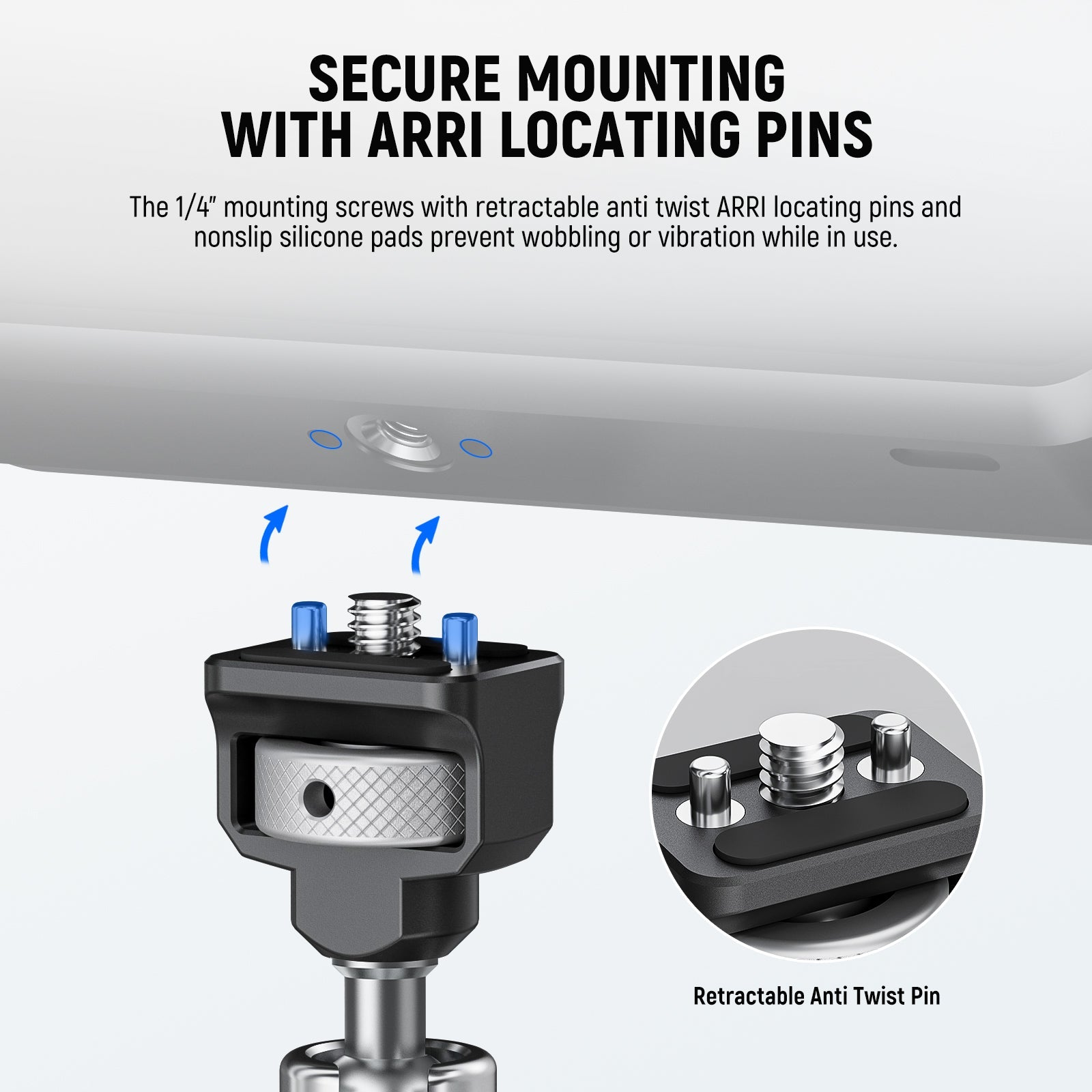 - Anti Twist Dual Safety Design- Each magic arm features retractable anti twist pins at the top, along with nonslip silicone pads that help prevent wobbling or vibration during use. Besides, the thumbscrews can be further secured via the positioning holes, ensuring a stable and reliable setup for photography and videography