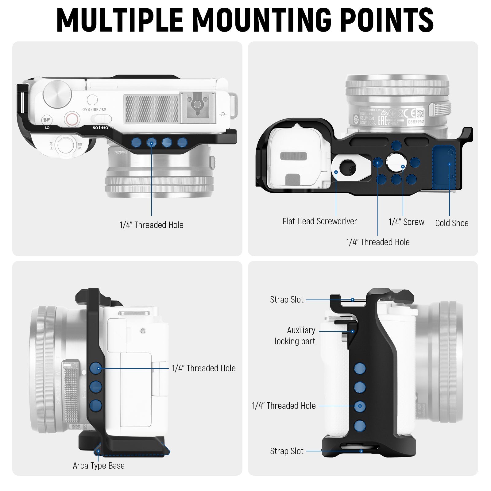 • Multiple Mounting Points- Abundant 1/4” female threads and a cold shoe mount maximize your accessory expansion options. For instance, magic arms, small microphones, and compact LED video lights can be attached to the cage for enhanced video quality