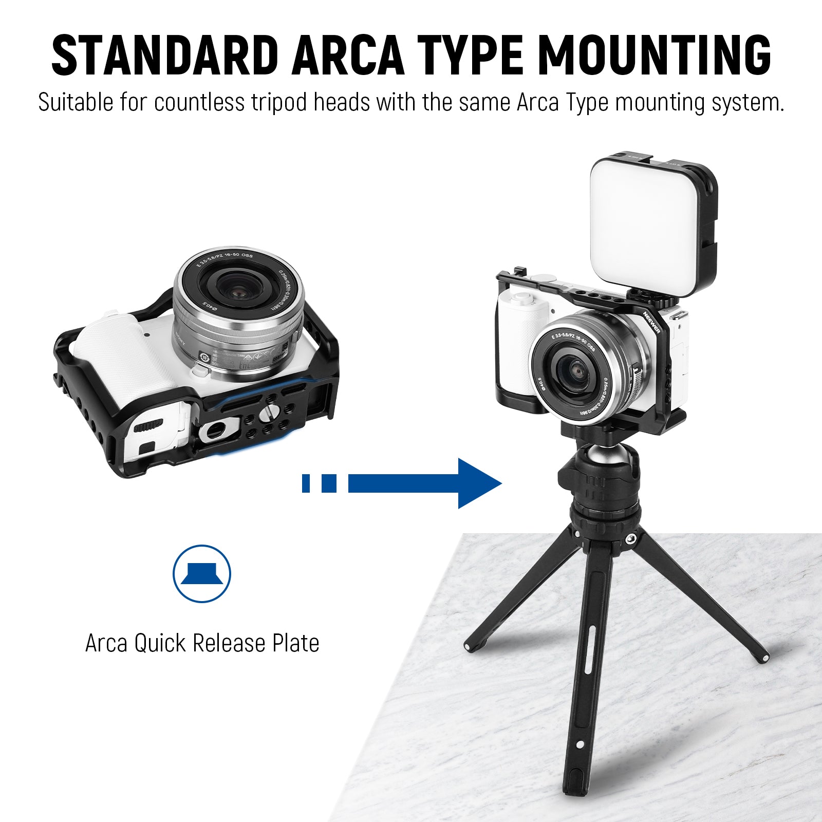 • Universal Arca Type QR Plate Base- With a standard Arca type base, the camera cage can swiftly mount on any tripod head compatible with the Arca Swiss mounting system