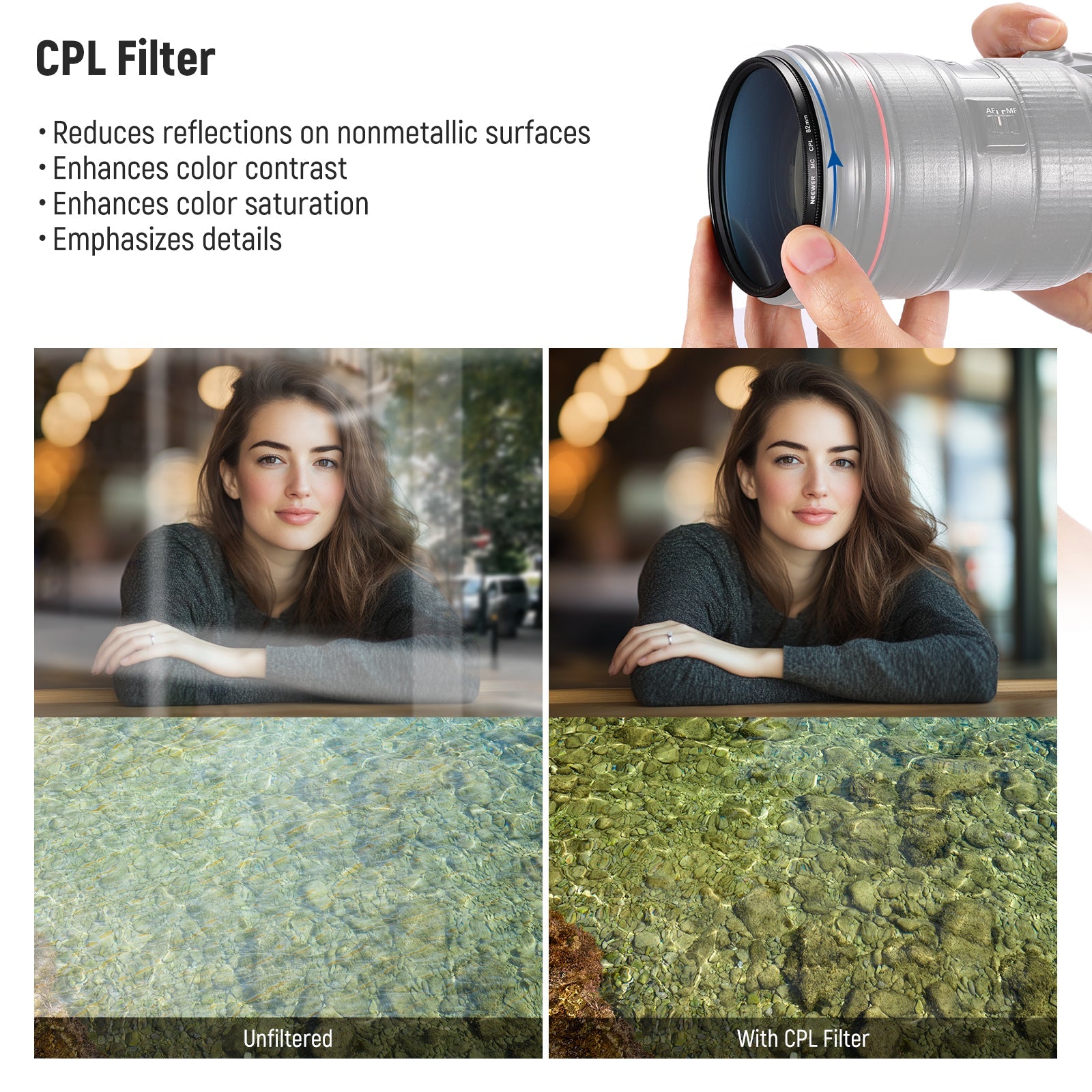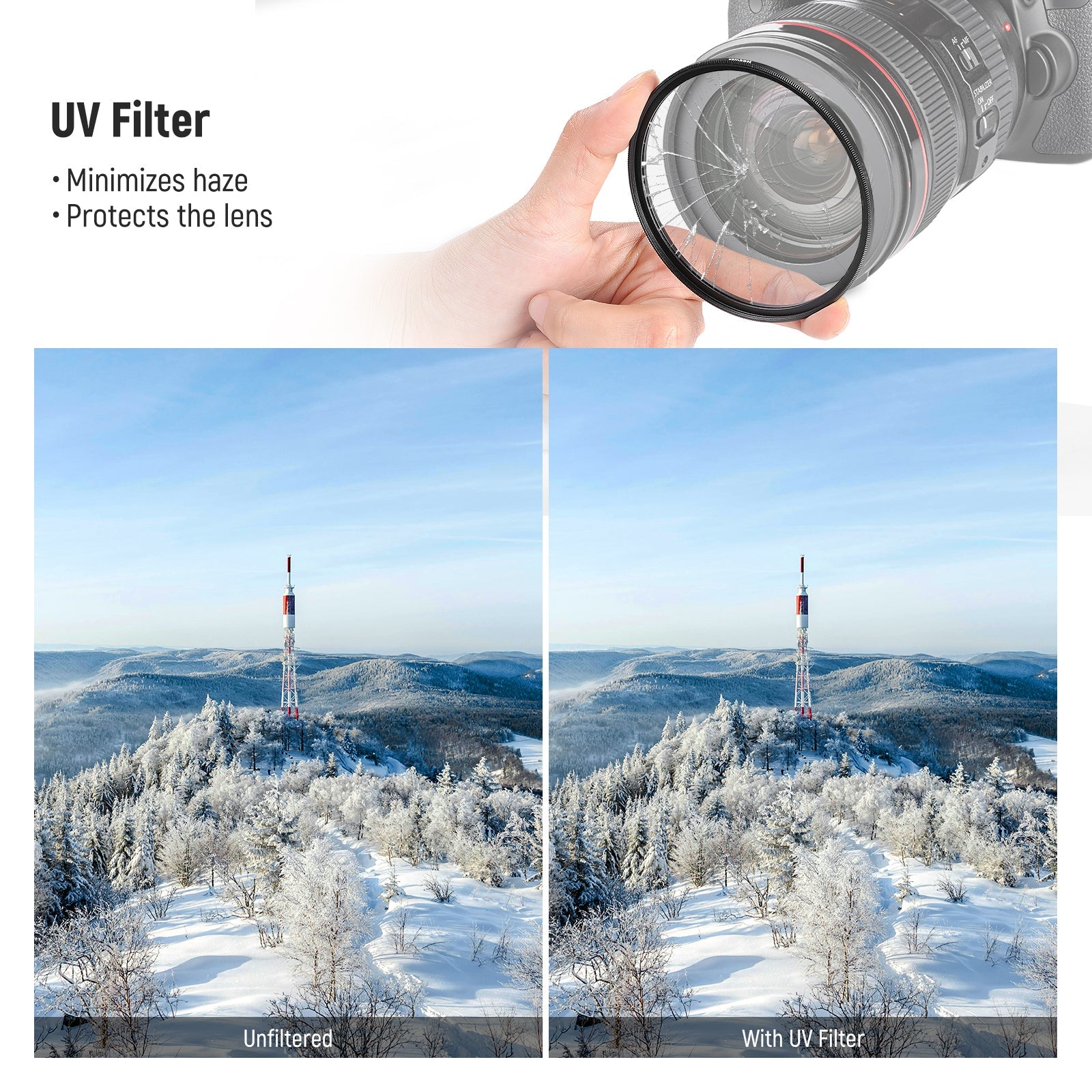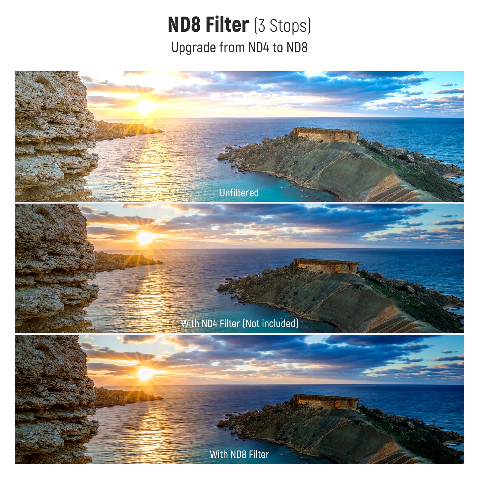 - Get Three Effects In One Kit- This set offers three essential filters: a UV filter that eliminates haze and protects the lens from uv rays, a circular polarizer filter that minimizes reflections on nonmetallic surfaces (like water and glass) and enhances contrast and saturation, and a ND8 filter that reduces light by 3 stops to create dynamic motion blur. Ideal as content creator essential photography accessories and influencer must have digital camera photo gear
