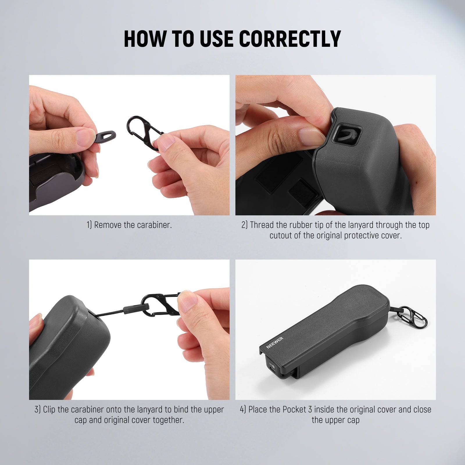 • How to Use Correctly- 1) Thread the rubber tip of the lanyard through the top cutout of the original protective cover. 2) Clip the carabiner onto the lanyard to bind the upper cap and original cover together. 3) Place the Pocket 3 inside the original cover and close the upper cap