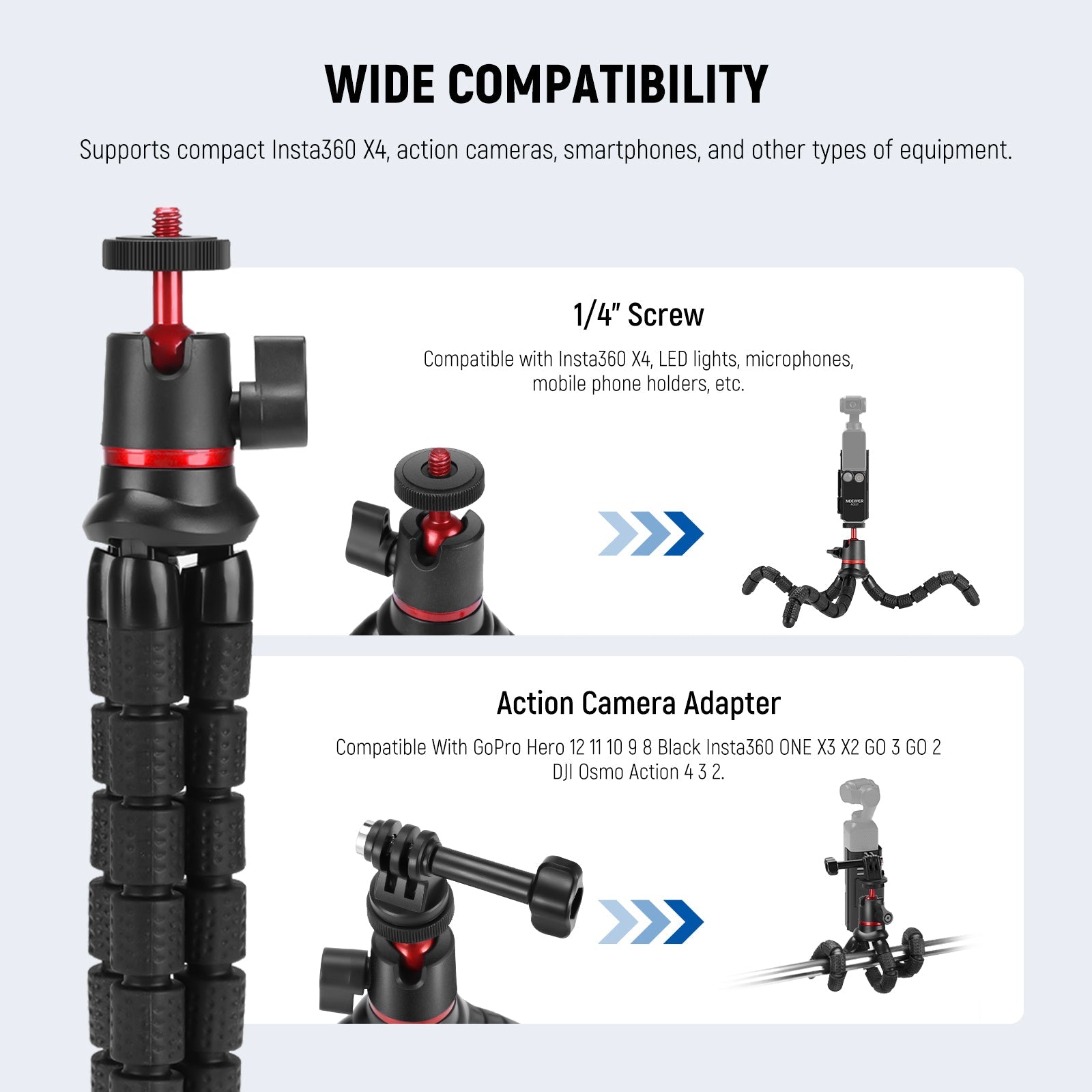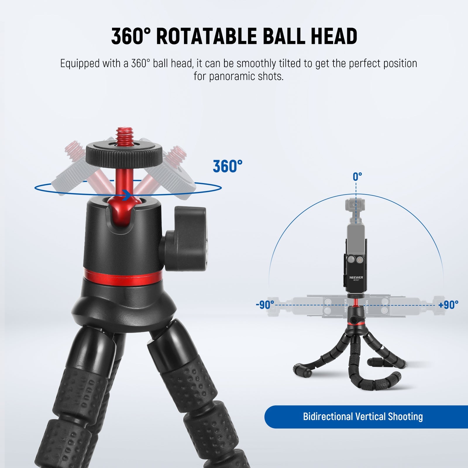 - Flexible Mini Tripod with Ball Head- The ball head offers 360< swivel adjustment, enabling effortless switching between landscape and portrait modes. Beyond handheld shooting, the tripod stand with bendable legs can securely stand on flat surfaces or wrap around poles and branches, allowing for easy video recording and photography from dynamic angles.