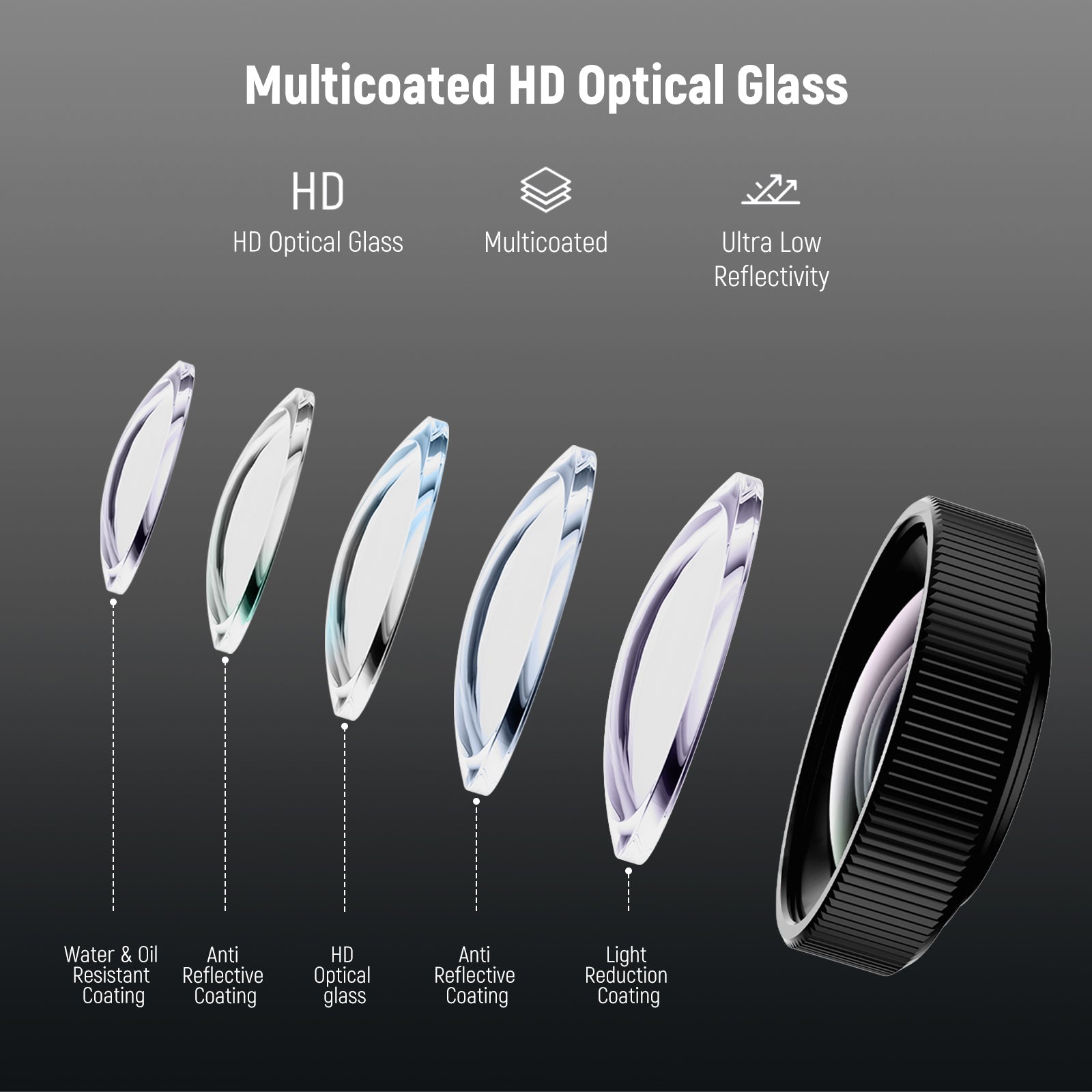 - Multicoated HD Optical Glass- HD optical glass with 2 elements in 1 group ensures high clarity. Multiple protective coatings with low reflectance effectively reduce glare and ghosting while resisting smudges and fingerprints