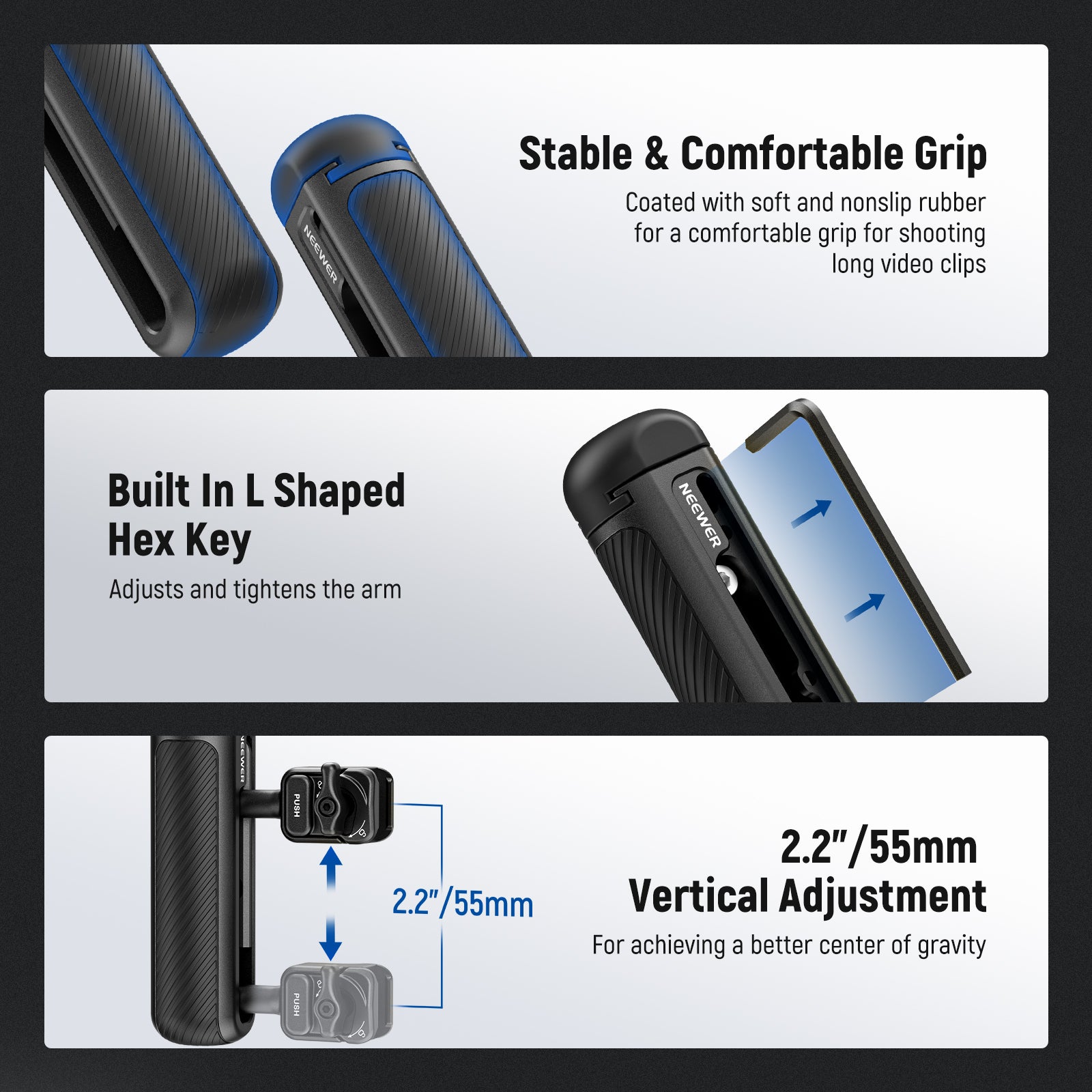- 360° Rotation & Vertical Adjustment- The phone handle grip is 360° rotatable for working as a side handle or a top handle for low angle shooting. It also supports 2.2"/55mm vertical adjustment for achieving a better center of gravity