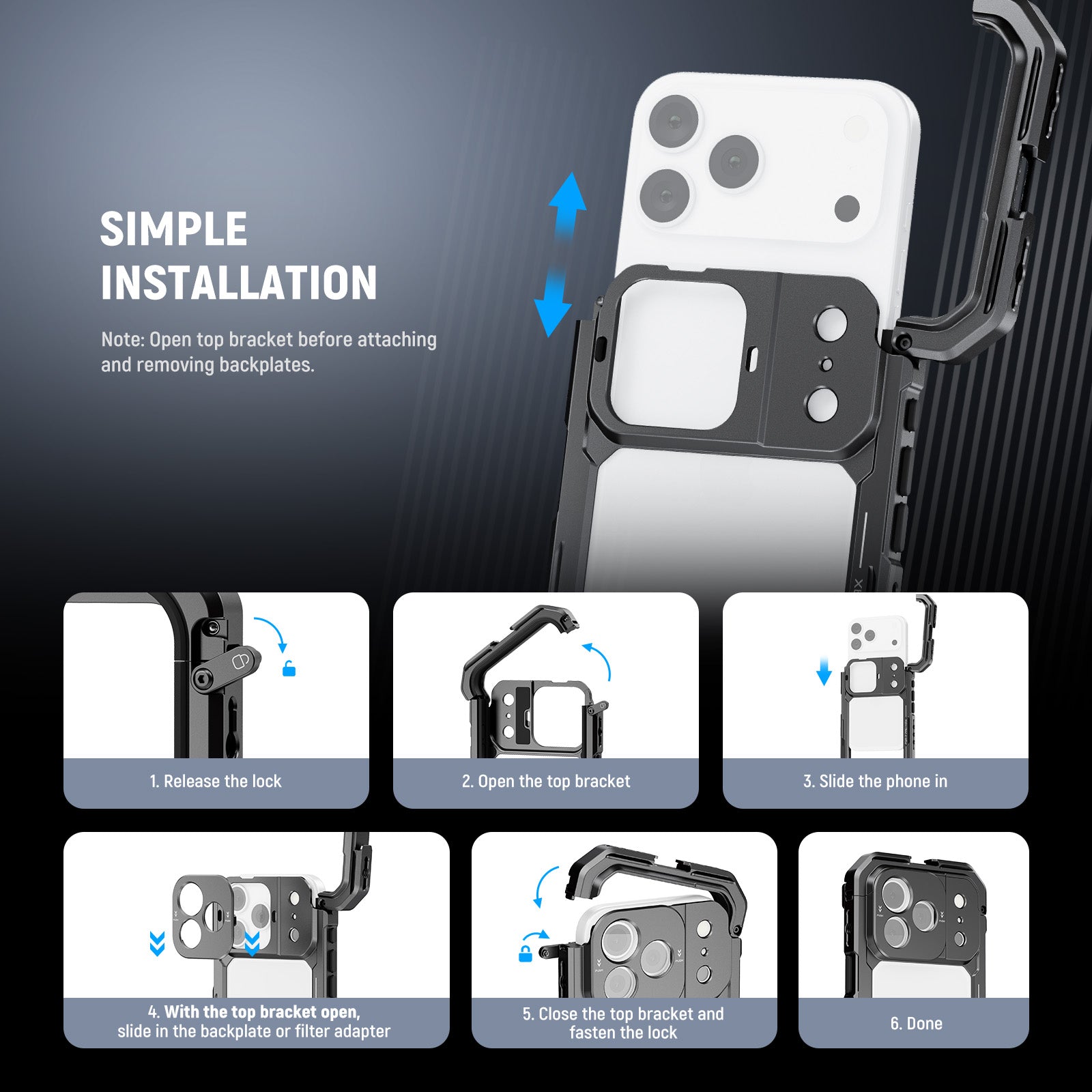 - Compatible with iPhone 17 Pro/Pro Max - This aluminum alloy cell phone cage video rig with shockproof rubber linings shields your phone during video recording, YouTube/TikTok vlogging, live streaming, mobile photography, and filmmaking like a gimbal stabilizer holder equipment as professional smartphone camera filming accessories. It includes three interchangeable backplates to connect filters and lenses for unlimited creativity. Note: Open the top bracket to install a backplate, then close it to secure