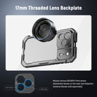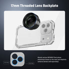 - 17mm Phone Lens Backplate - Mounts 105mm macro, 10x macro, 8mm fisheye, 45x microscope with LED light, 7x telephoto, 60mm telephoto, 18mm wide angle, 1.55x blue anamorphic, and other 17mm threaded NEEWER phone attachment lenses to the Main Camera and Telephoto Camera (lenses sold separately)