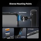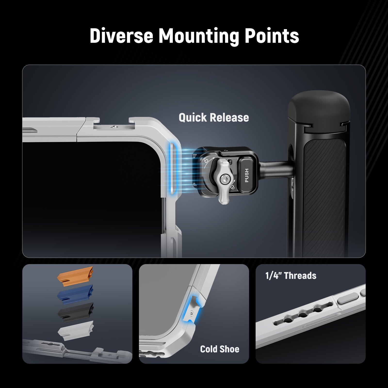 - Diverse Mounting Points - The cage features mounting slots for PA045/PA045E Quick Release Side Handle, 1/4" threads for T29/T30/T31 Tabletop Tripod, and cold shoe mounts for RGB62 Mini LED Video Light, CM31 Wireless Lavalier Microphone System, and more
