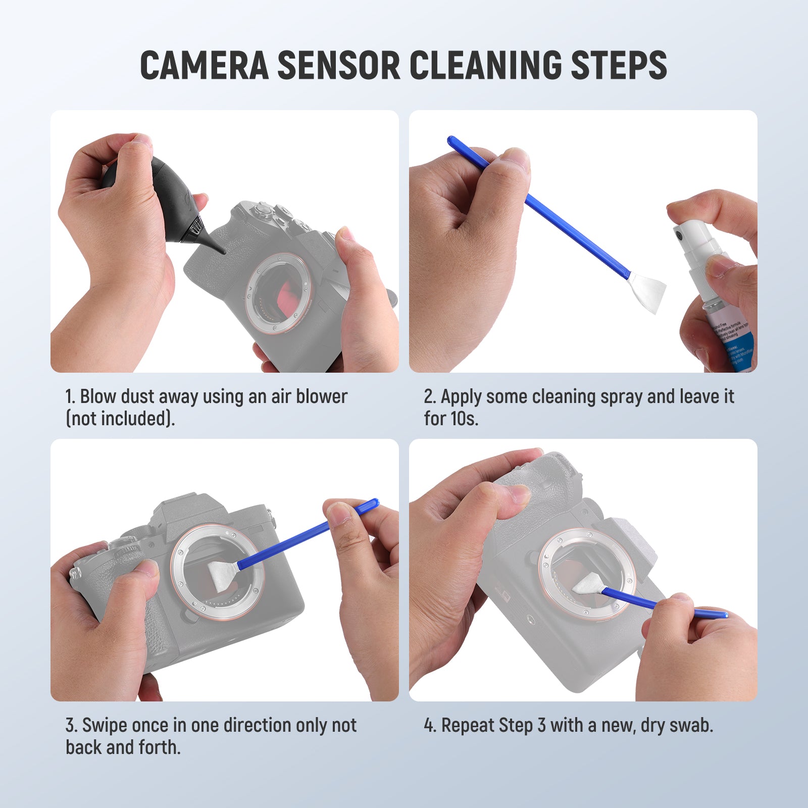 - Professional Camera Cleaning Kit- The cleaning accessories kit includes 10 x Cleaning Swab for 24mm Full Frame Sensor, 1 x Cleaner Spray, 1 x Cleaning Cloth—safe to use on all electronics, coated lenses, and camera sensors