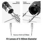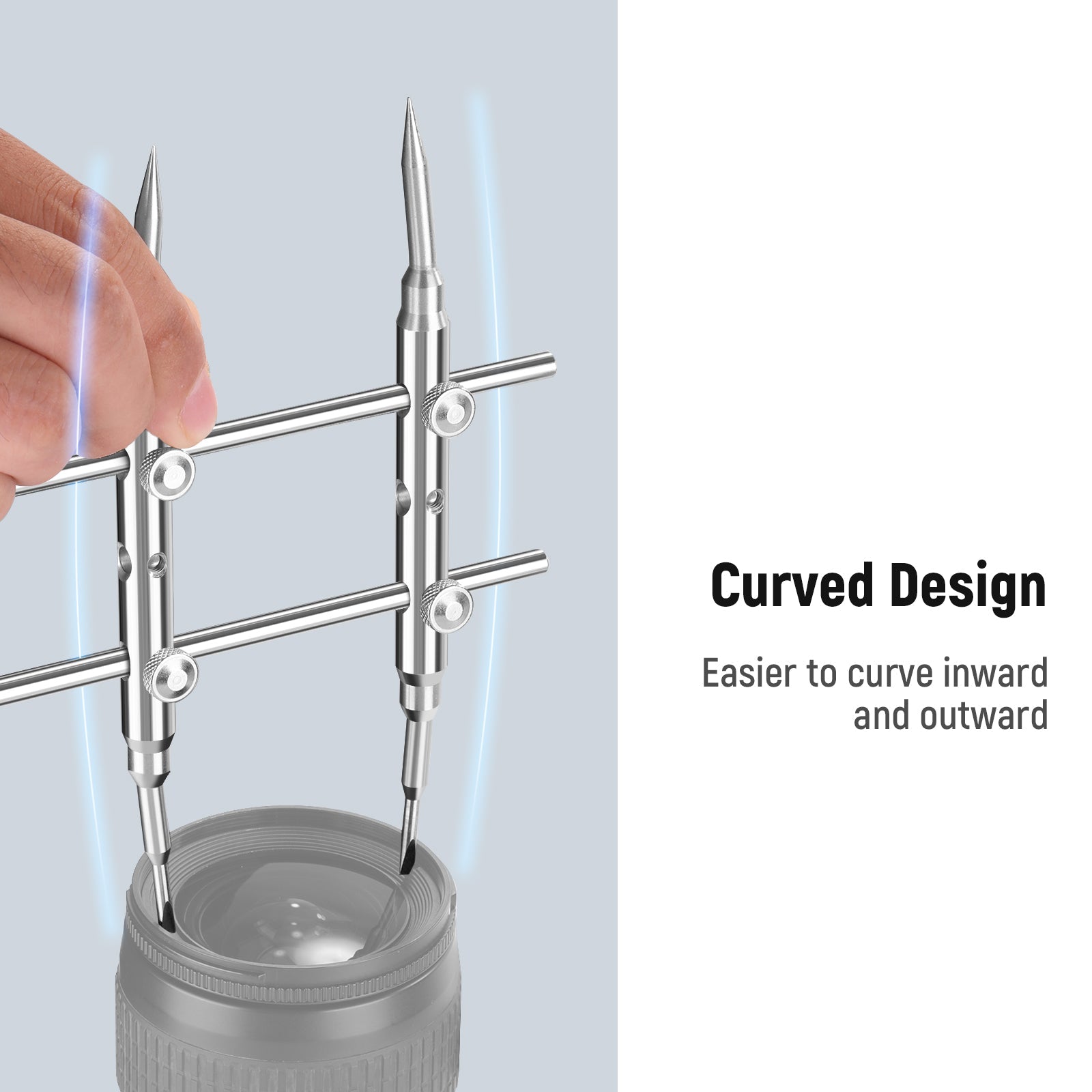 - Curved Tip with Adjustable Opening- The curved tip fits perfectly for convex lens with curved or slanted retaining ring. The curve design makes the wrench capable of not only curing outward, but also curving inward. The arms can be adjusted to make the distance between the two tips match various lens ranging from 5mm to 110mm in diameter