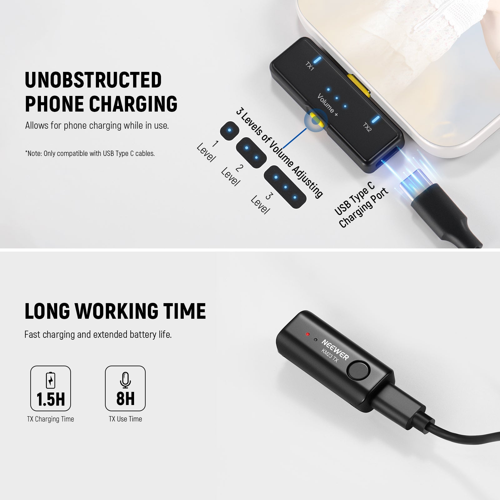 - Wireless Lav Mic for USB C- NEEWER Clip on Microphone Set comes with two transmitters(TX) and a receiver(RX). The receiver of the external microphone kit is compatible with the iPhone 16 15 Pro Max Plus iPad series compatible with Samsung Galaxy S24 S23 Ultra, Android phones, PCs, laptops and other equipment with a Type C interface, delivering professional video recording. The included two tiny magnet accessories can help the transmitter clips to be fixed