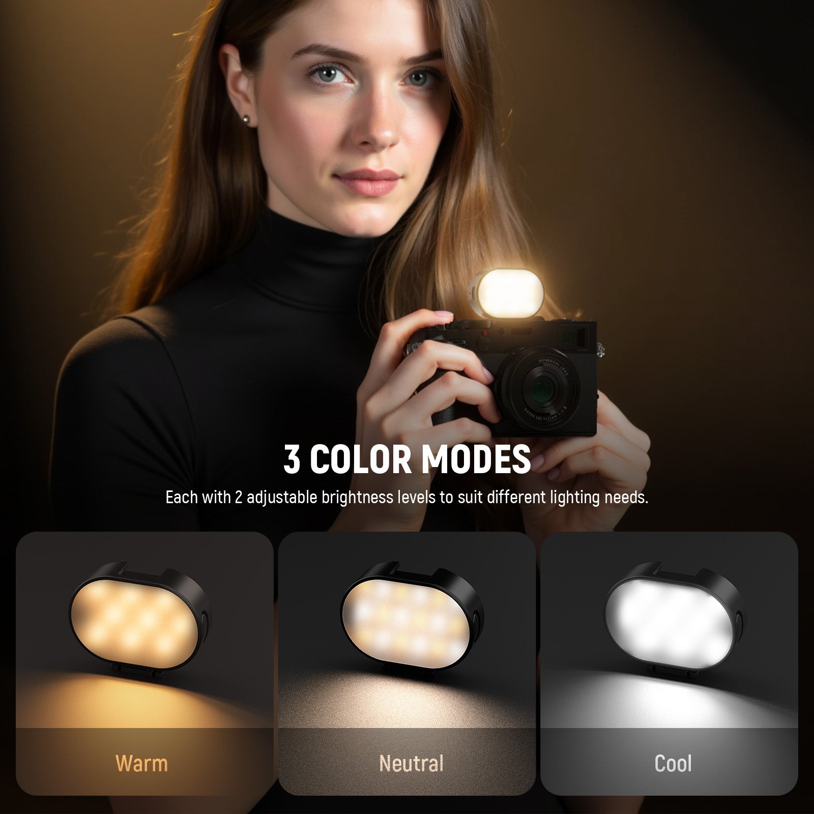 • 3 Color Modes with Adjustable Brightness- This mini camera auxiliary cube light with 9 warm & 9 cool high performance LEDs offers 3 color temperature modes (warm, neutral, cool), each with 2 adjustable brightness levels to suit different lighting needs. With high CRI95+/TLCI98+, it ensures accurate color reproduction. All settings are controlled via a single button for quick adjustment without hassle