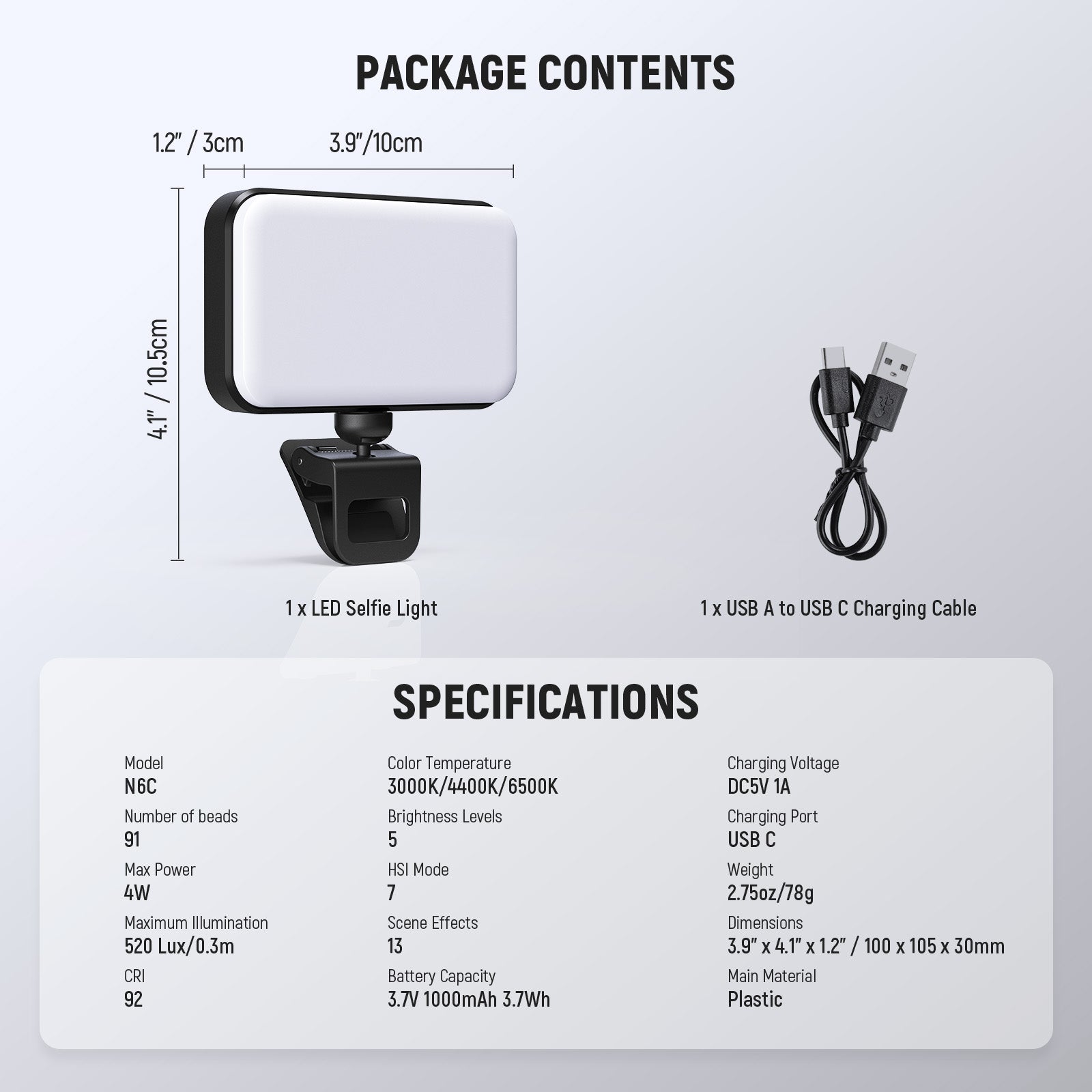 - Compact & Lightweight Phone Light- NEEWER N6C clip on overhead light is a premium soft fill light, compact at 3.9"x4.1"x1.2"/100x105x30mm, weighing only 2.75oz/78g. Mount onto a cellphone camera (compatible with iPhone), desk laptop, or desktop PC to flatter your skin and enhance your look during selfies, vlogging recording, video conferencing, live streaming, zoom calls, and more. The clamp features a ball head that enables 360< rotation and front to back tilting for versatile lighting angles