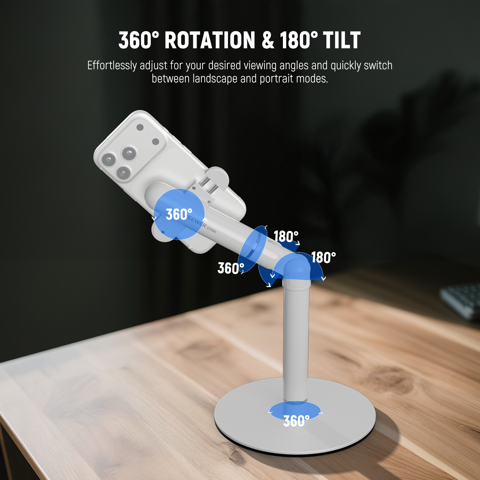 - 360° Rotation & 180° Tilt- With a remarkable 180° tilt and a full 360° rotation, the cell phone stand allows for effortless angle adjustments and quick switching between landscape and portrait modes, providing optimal angles for watching videos, cooking from a recipe, or participating in video calls