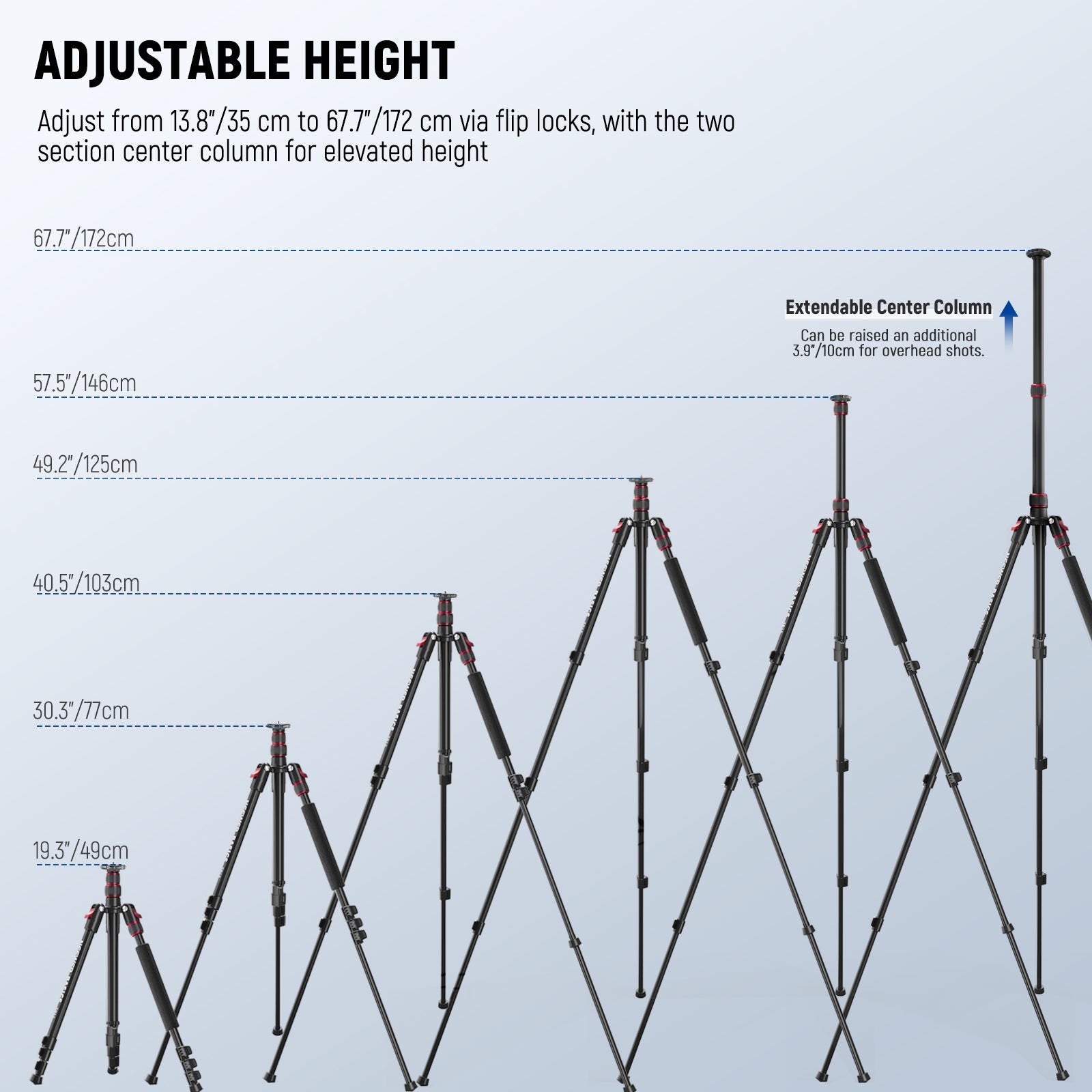 - Heavy Duty Travel Tripod- Made of lightweight aluminum alloy, the professional camera tripod supports a DSLR camera up to 17.6 lbs/8 kg. Adjust from 17"/43 cm to 71"/180 cm via flip locks, with the two section center column for elevated height, and push and hold to adjust from 24°, 57° and 86° as you desire, with the the interchangeable non slip rubber feet and metal spikes for stability on different terrains. Weighing 3.1 lbs/1.4 kg and reversible to 17.3"/44 cm for easy carrying with bag