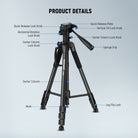 - Horizontally Mounting Central Axis- For more creative possibilities, you can horizontally mount the center column to the 3 way pan tilt head for overhead shots. Or directly detach the central axis to use the tripod as a monopod. Also, the 4 section tripod legs offer an adjustable height range from 23.6"/60cm to 74.4"/189cm
