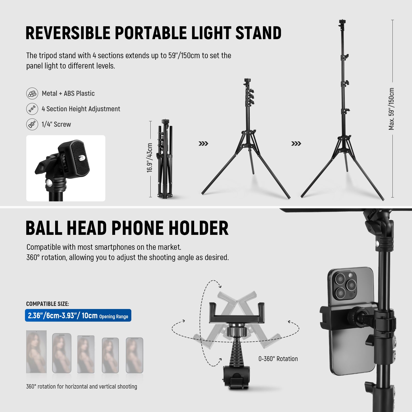 - Reversible Portable Light Stand- The tripod stand with 4 sections extends up to 59''/150cm to set the panel light to different levels. Equipped with an adjustable 1/4" mount, it allows you to adjust the lighting angle flexibly, supporting 180° tilt and 360° rotation. The light stand folds down to a compact 16.9''/43cm for easy transport