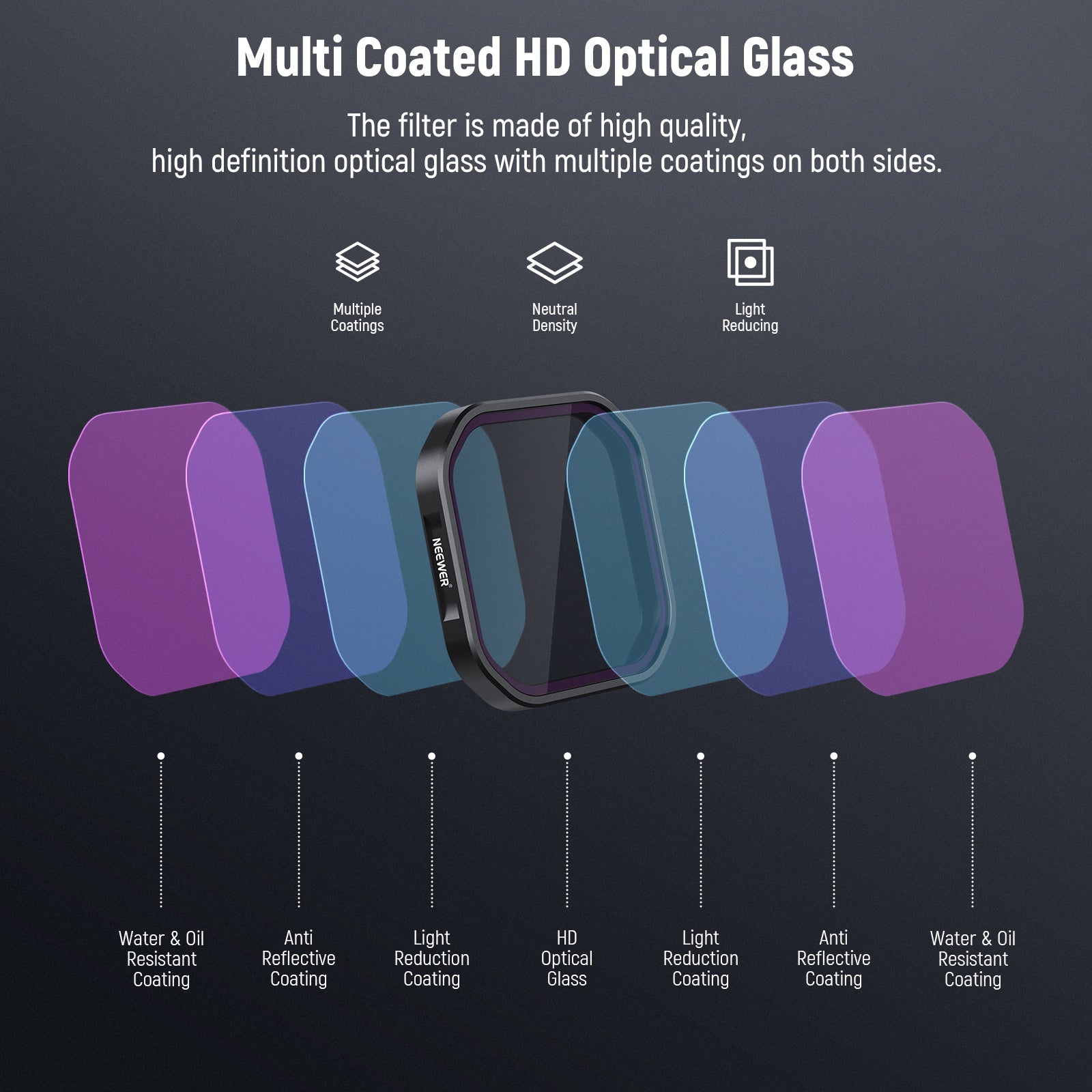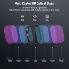 • Multicoated HD Optical Glass- HD optical glass ensures high clarity and accurate color reproduction. Multiple coatings on both sides of the glass are resistant to water, fingerprints, smudge, and scratches, making filters easy to clean