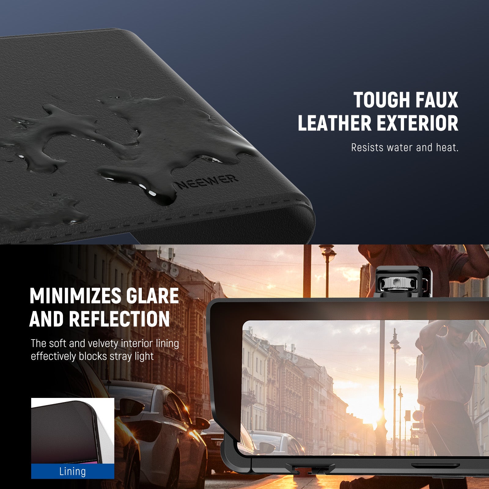 - Enduring Faux Leather Exterior- The weather resistant synthetic leather can withstand rain and sunlight, ideal for outdoor mobile photography, vlogging, live streaming, and filmmaking