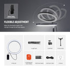- 24W Powerful RGB Ring Light Kit- High power 24W key or soft fill light for makeup artist, esthetician lash eyelash extension, tattoo, barber, podcast, live streaming, Zoom calls, studio photoshoots, TikTok social media video recording. With 84 warm white, 84 cool white, 84 RGB LEDs, this lighting equipment covers 360° full RGB colors with 1780lux/0.5m (7000K) illuminance, 2500K-10000K CCT adjustment, 0-100% dimming, CRI 95+/TLCI 97+ for bright, diffused, even light with high color accuracy