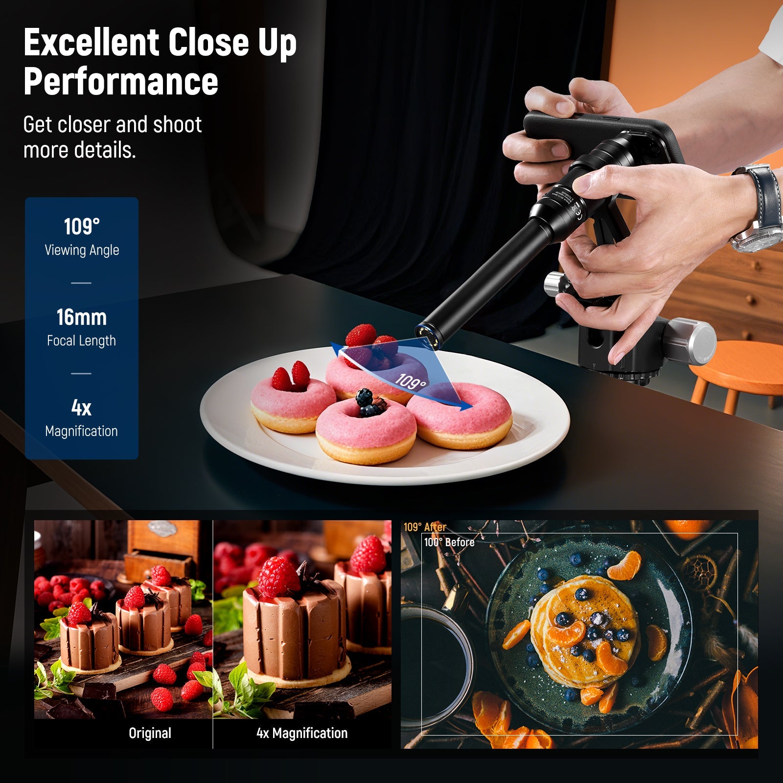 - 4x Magnification & 109< Expanded FOV- With 4x magnification and a 109< expanded field of view, this macro probe lens allows you to capture breathtaking details (such as food, miniatures, and insects) and fit more subjects into the frame. A 340mm slender barrel with 16mm focal distance can get into narrow spaces like animal burrows and pipes while keeping a safe distance