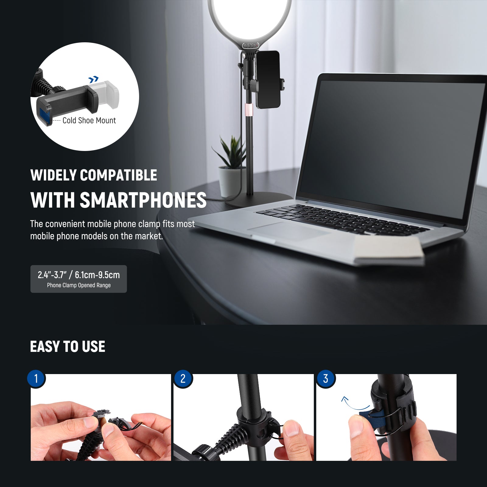 - Ideal for Phone Photography- A 360< rotatable phone holder mount of the overhead table ringlight enables portrait and landscape camera orientations. This photography and videography lighting gear and accessories kit for photos, pictures, films, video recording, vlogging, and filming creation, is compatible with iPhone 16 15 Pro Max Plus Samsung S24 Ultra cell phone and other smartphones